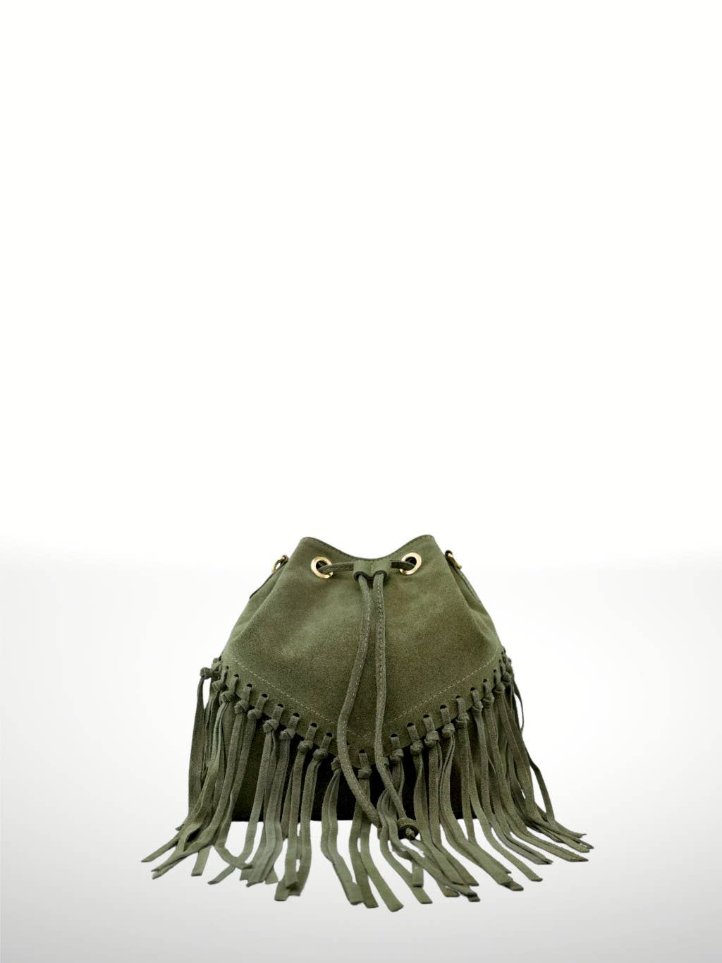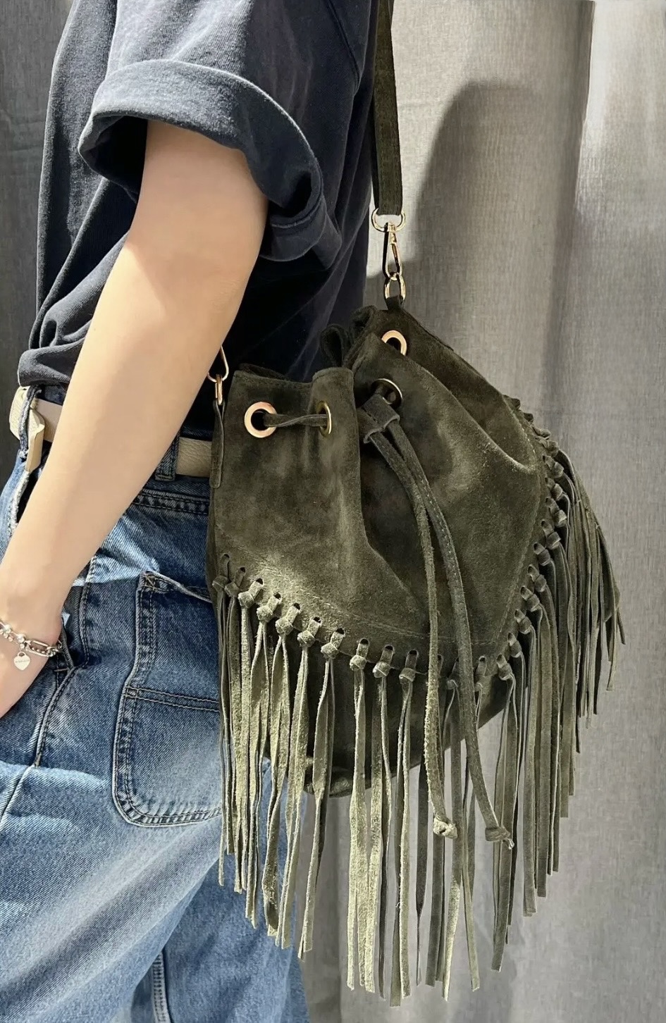 Descubre la elegancia y la versatilidad del bolso saco de ante italiano con flecos. Confeccionado con 100% Ante y fabricado en Italia, este bolso combina calidad artesanal con un diseño moderno y funcional.