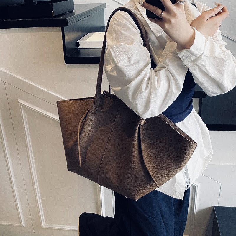 Cuenta con asas largas para llevar cómodamente al hombro y un interior espacioso que permite guardar todo lo esencial con total comodidad. Su diseño limpio, sin excesos, lo convierte en un básico imprescindible para quienes valoran la elegancia discreta y la funcionalidad.