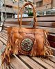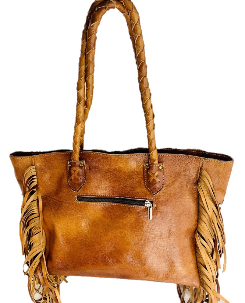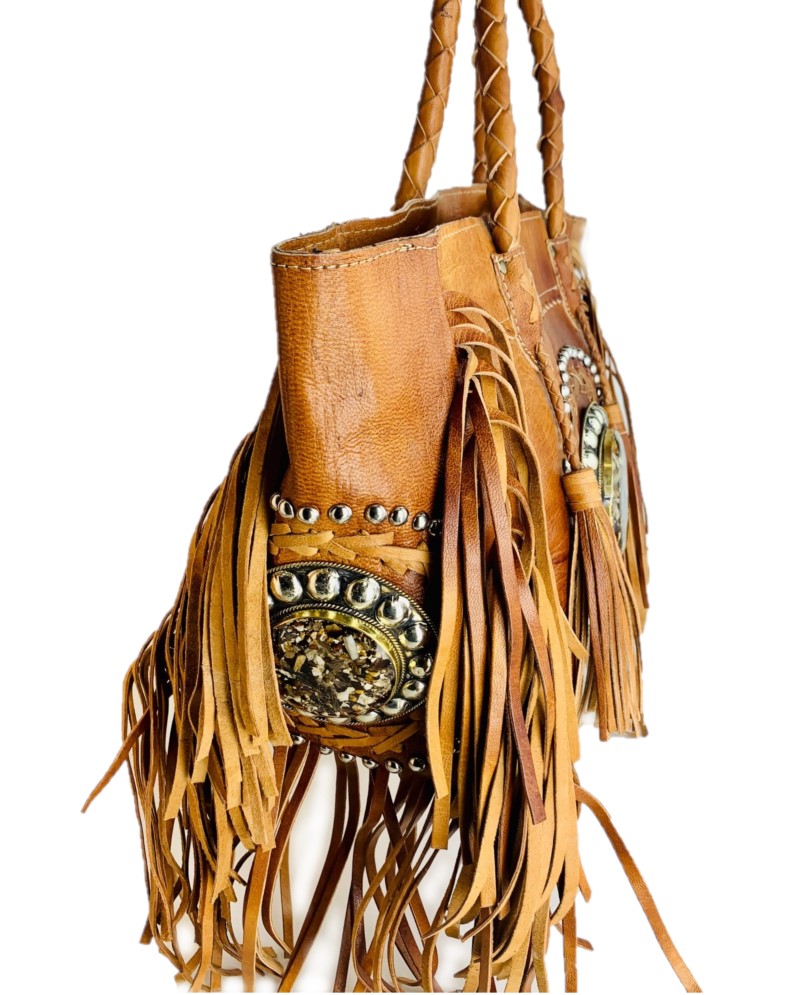 Es un gran bolso hippie con borlas de cuero, cuentas de metal adornadas y piel artesanal. Hermosa piel vintage hippie.