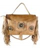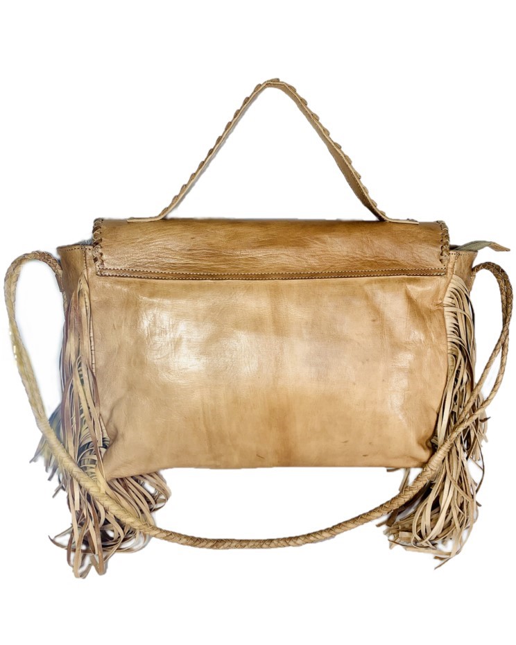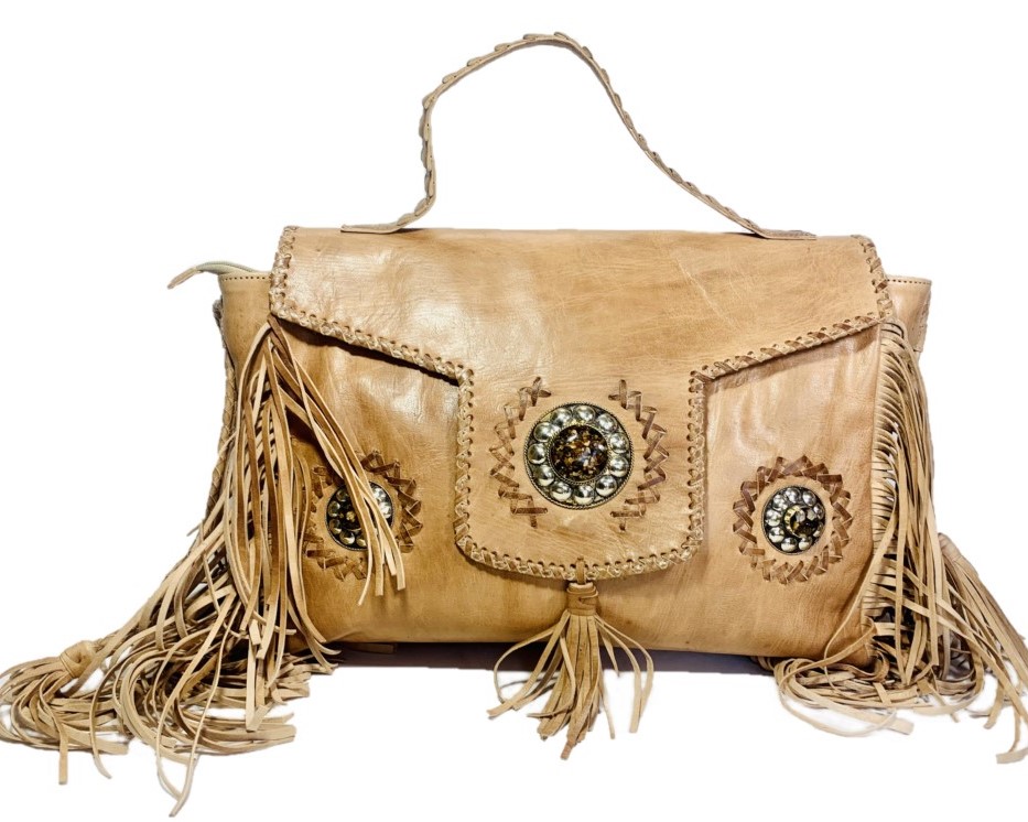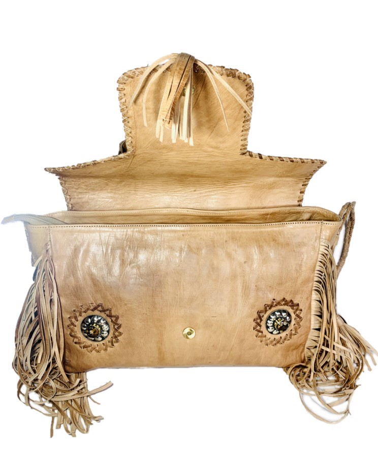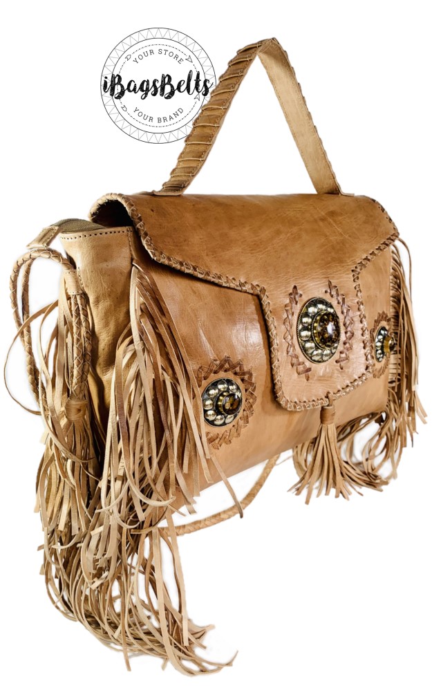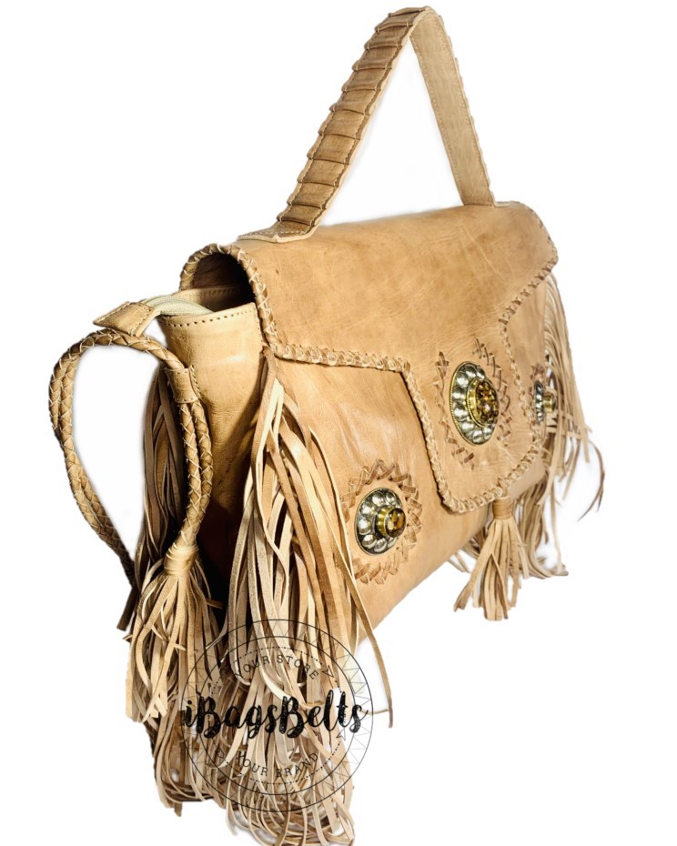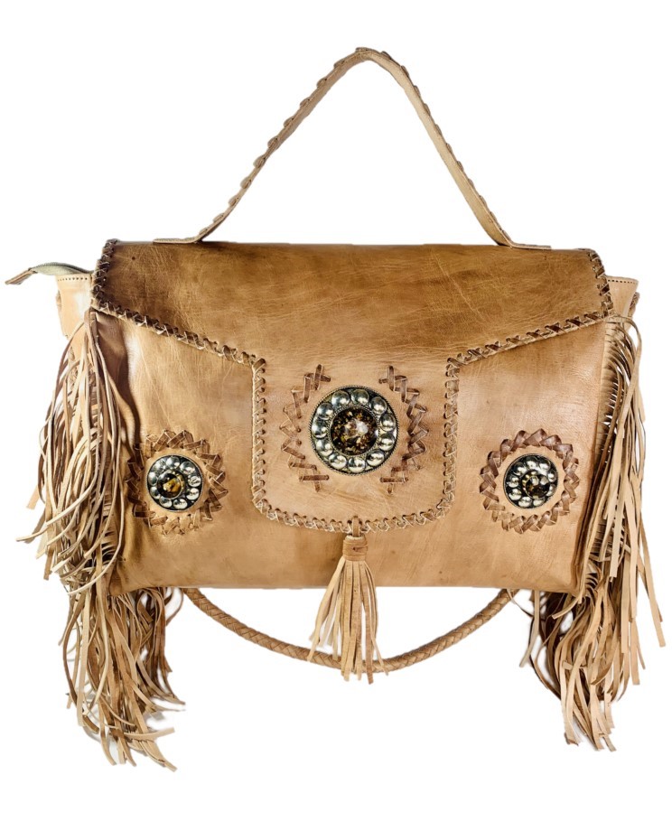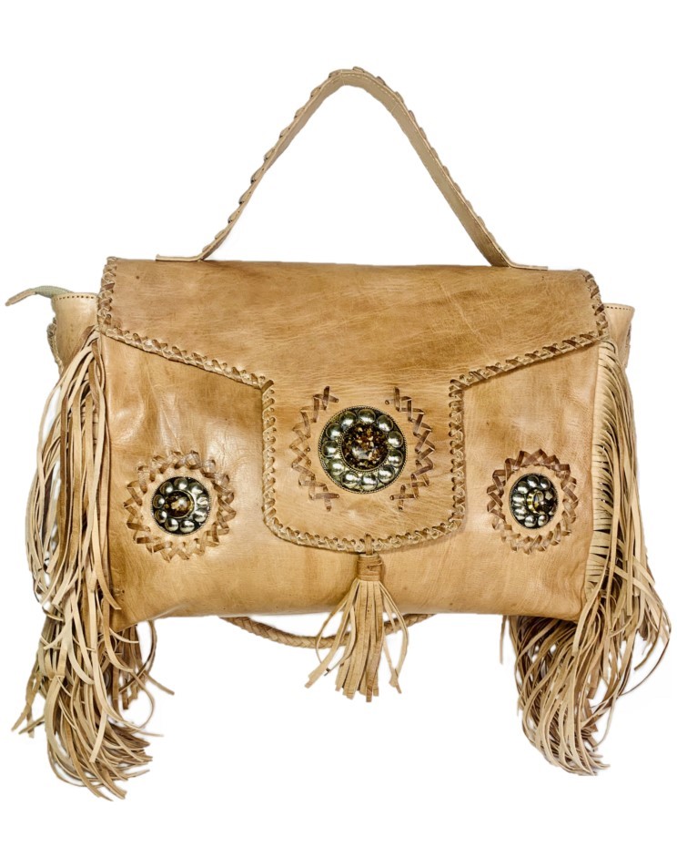 El bolso bordado de cuero estilo boho es una pieza única con un gran encanto hippie. Sus detalles de borlas y flecos de cuero le otorgan un aire distintivo y auténtico, mientras que los tres cabuchones artesanales en el frontal añaden un toque de elegancia artesanal.