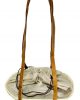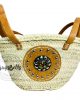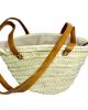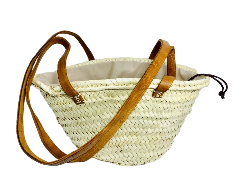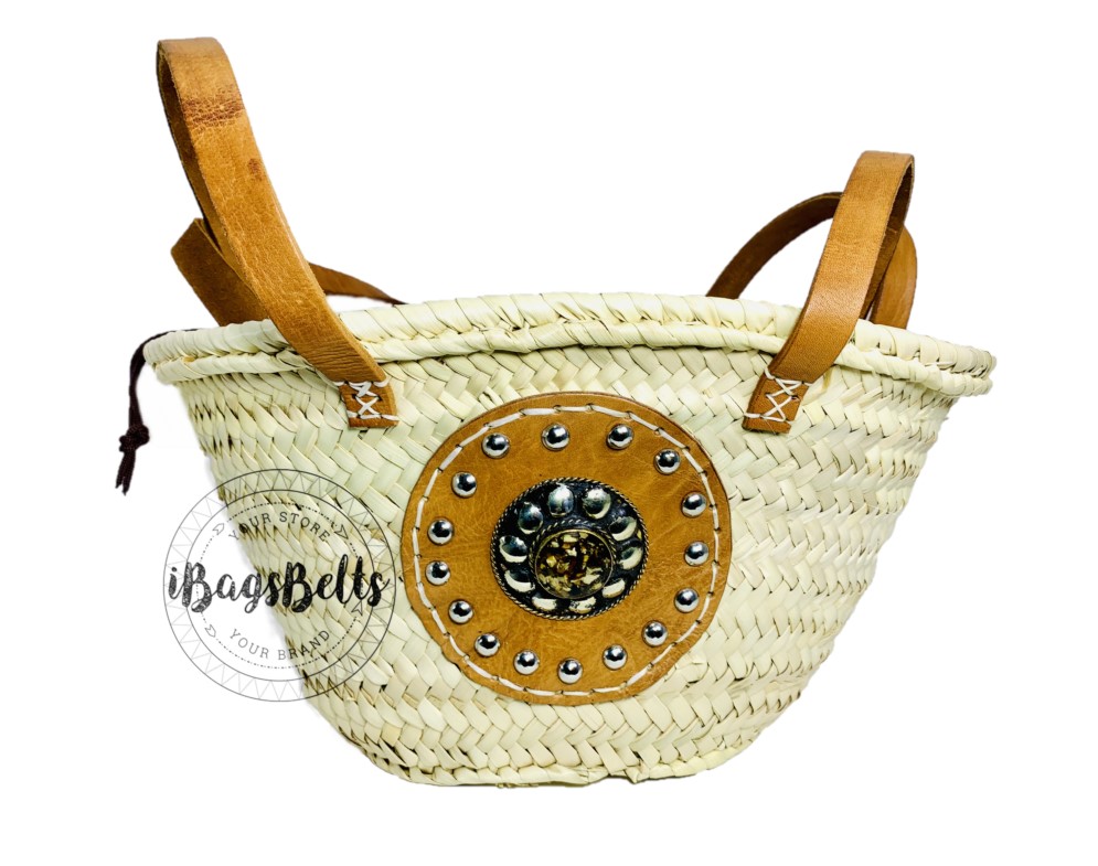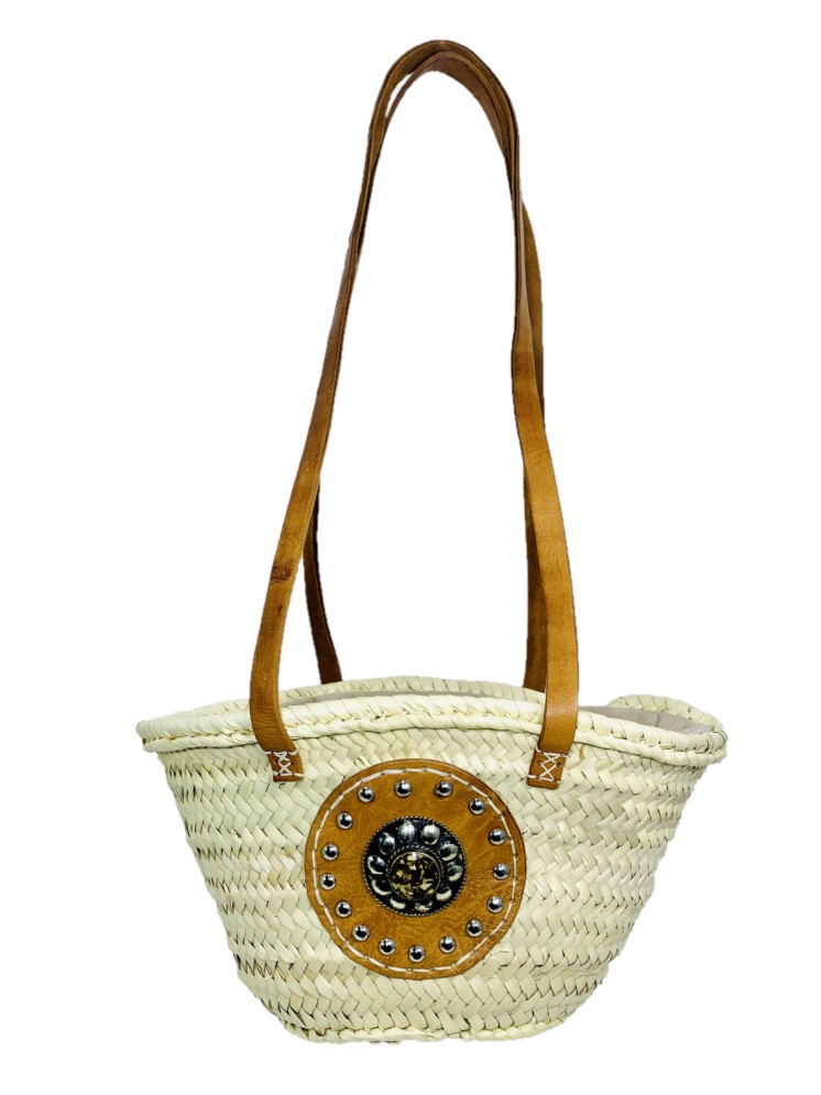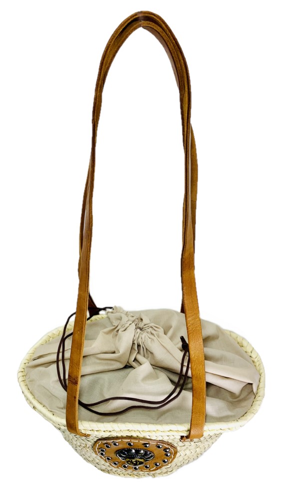 La cesta tipo rústica tejida con rafia. Asas de hombro de cuero. Es un capazo tipo bandolera resistente y totalmente revestido en su interior con tela. Decorado en el exterior con flecos de piel al igual que las asas. Rústico. Uso diario.