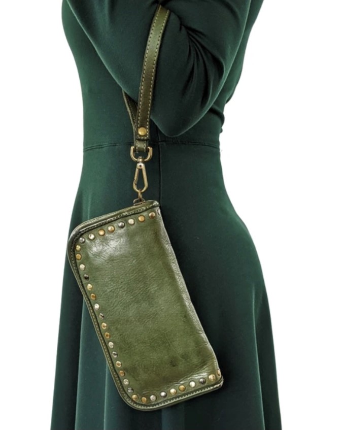 Con detalles de tachuelas de latón envejecido que añaden un toque de estilo, esta cartera es un accesorio imprescindible para cualquier persona con gusto por lo elegante y lo práctico.