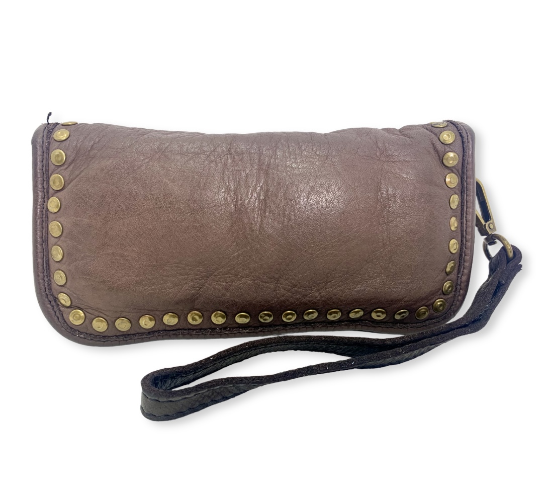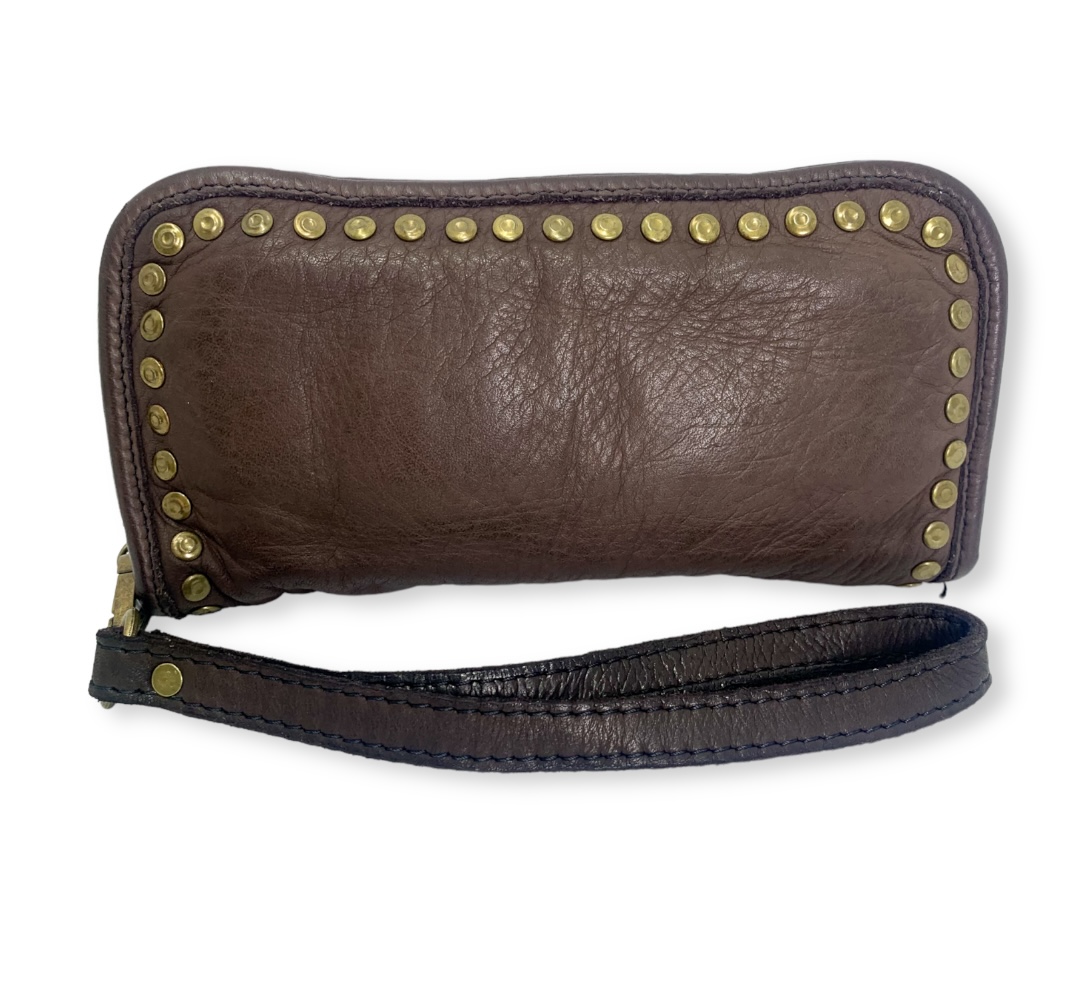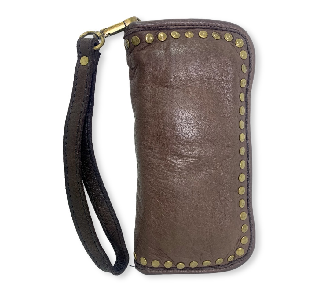 Con detalles de tachuelas de latón envejecido que añaden un toque de estilo, esta cartera es un accesorio imprescindible para cualquier persona con gusto por lo elegante y lo práctico.
