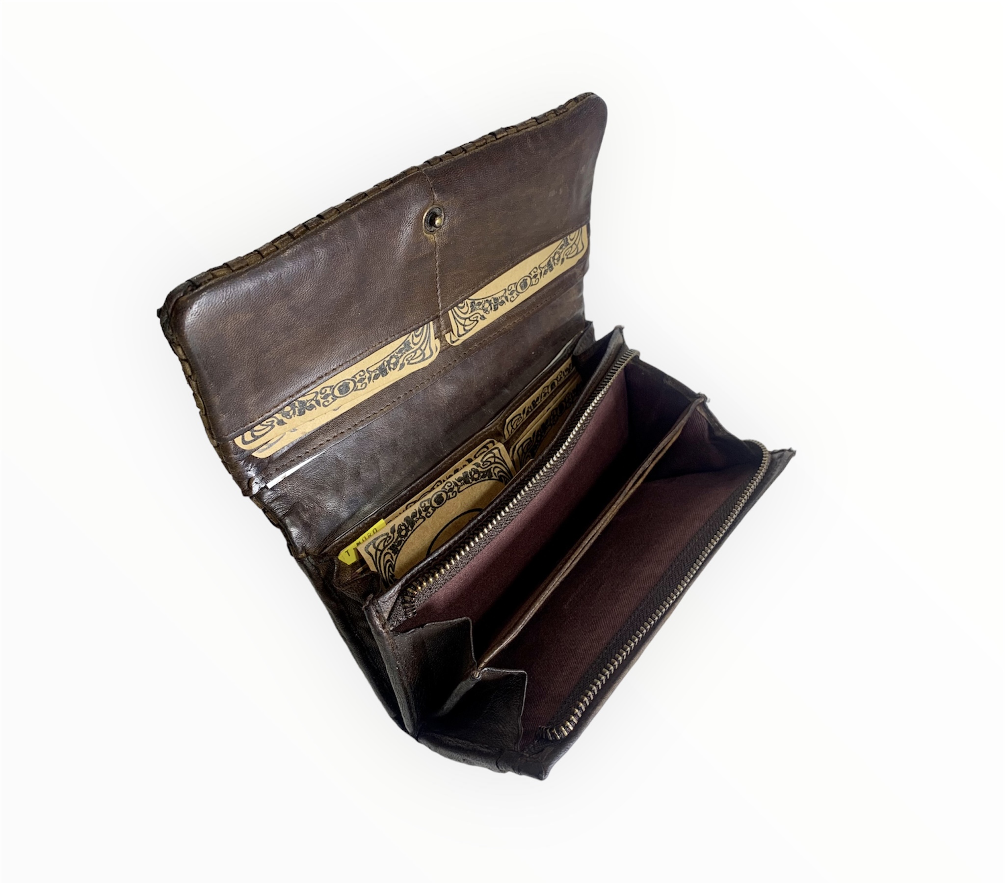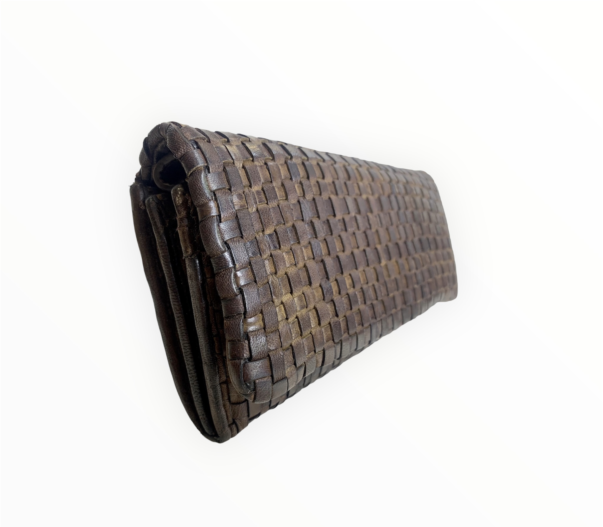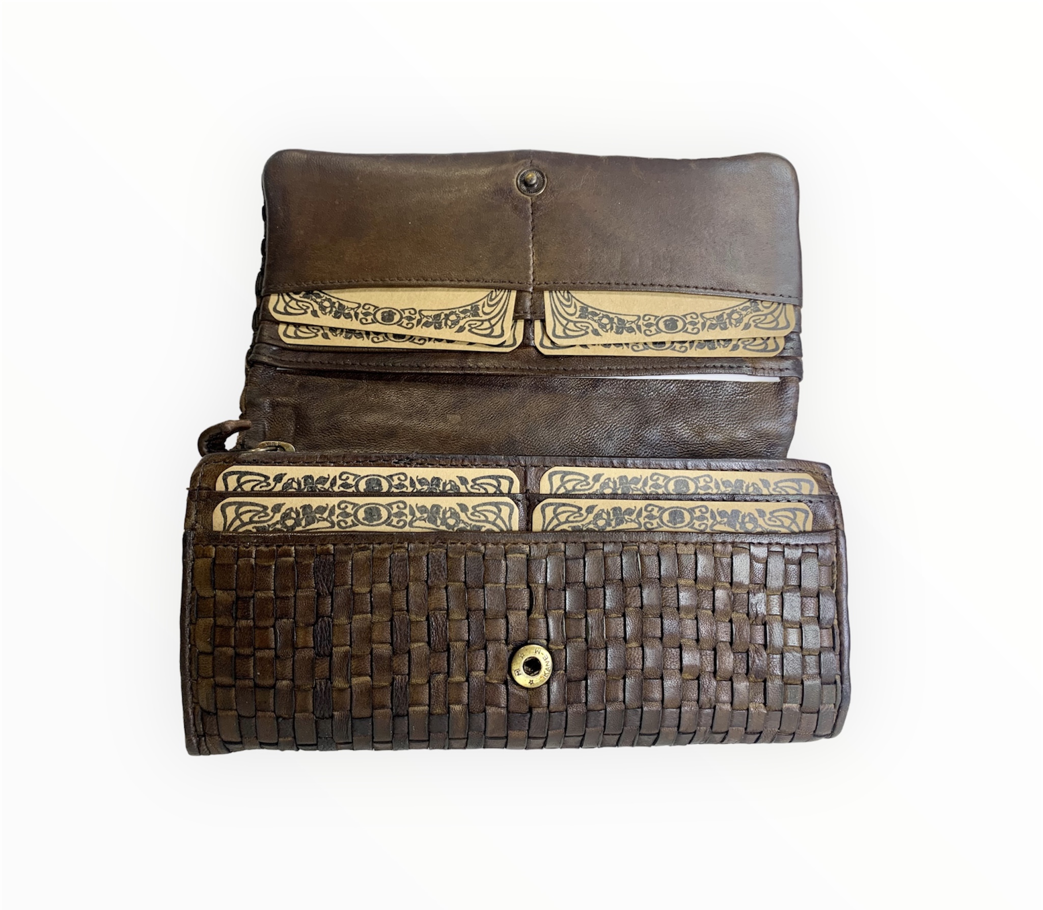 Fabricada a mano en suave cuero italiano vintage trenzado envejecido, nuestra nueva cartera, billetera, tarjetero es lo suficientemente espaciosa para su toda las cosas que usas en el dia. Sirve como bolso de mano para una salida nocturna.