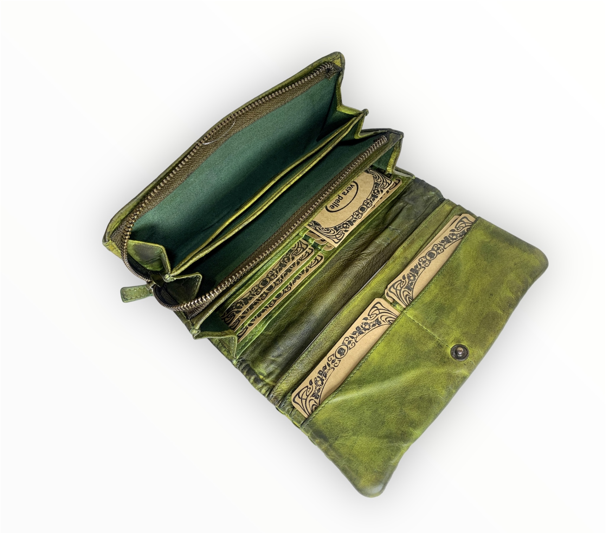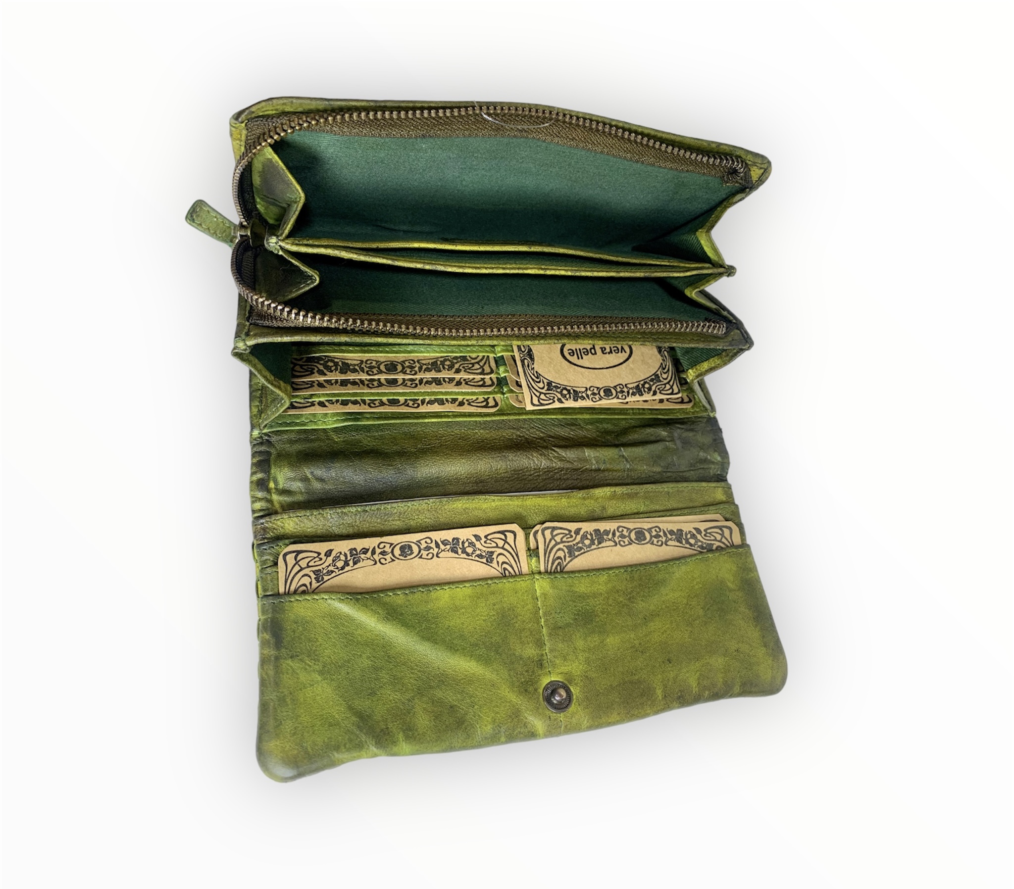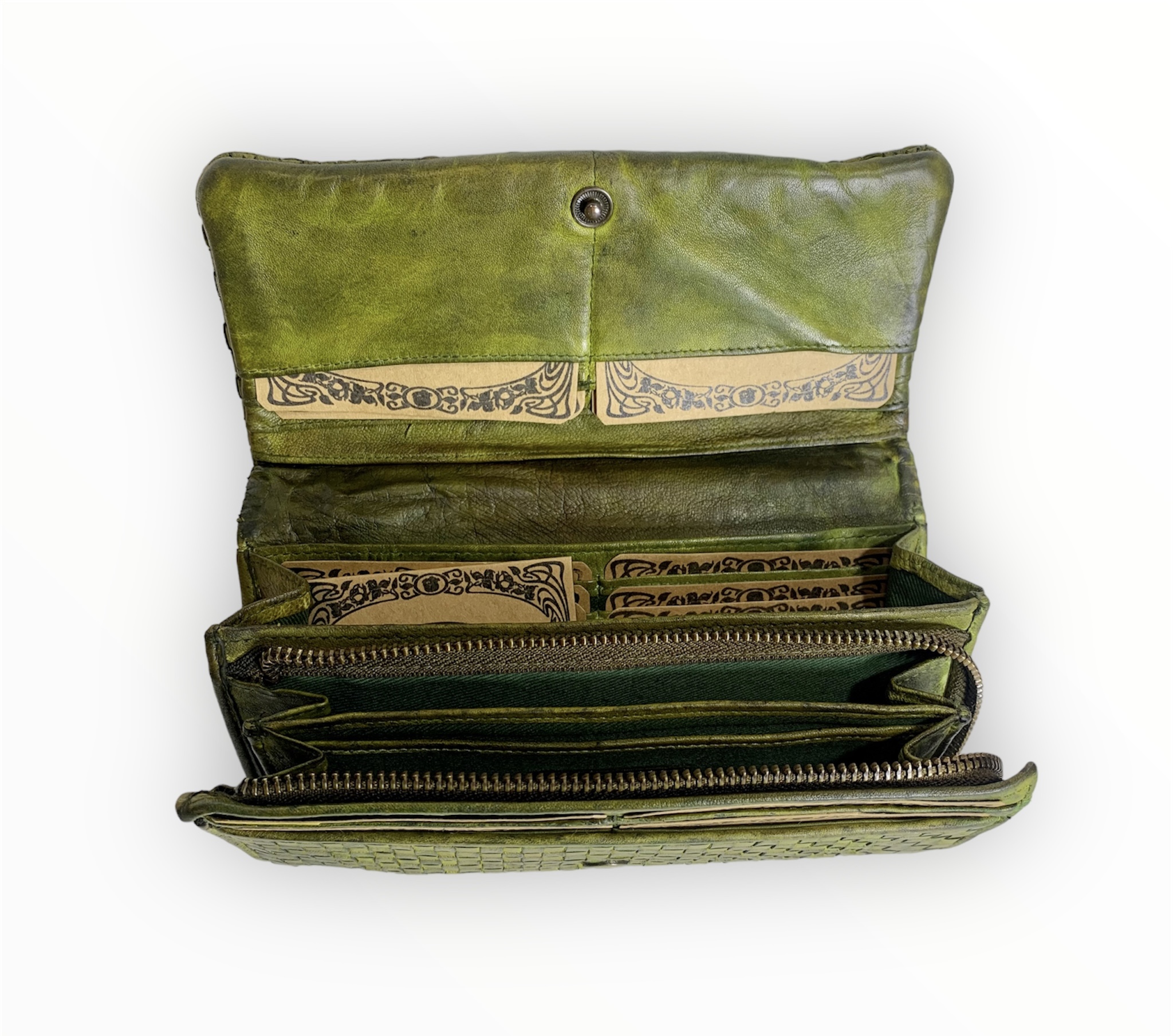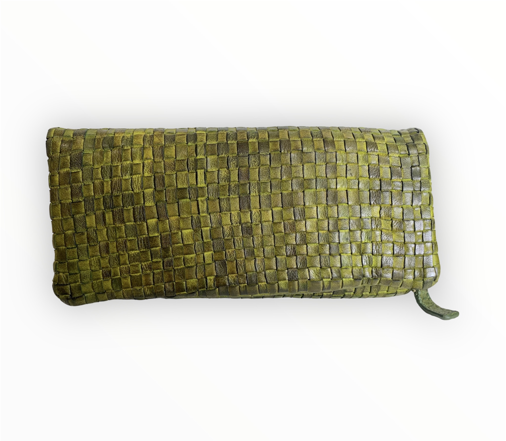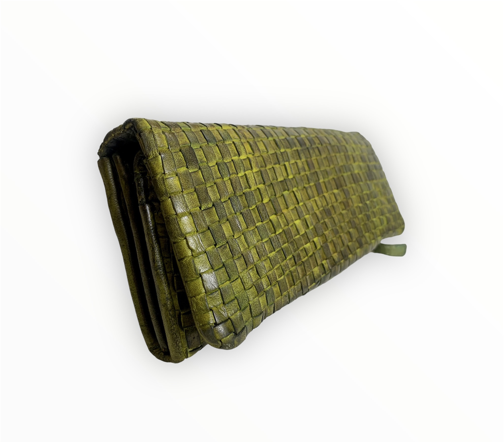 Fabricada a mano en suave cuero italiano vintage trenzado envejecido, nuestra nueva cartera, billetera, tarjetero es lo suficientemente espaciosa para su toda las cosas que usas en el dia. Sirve como bolso de mano para una salida nocturna.