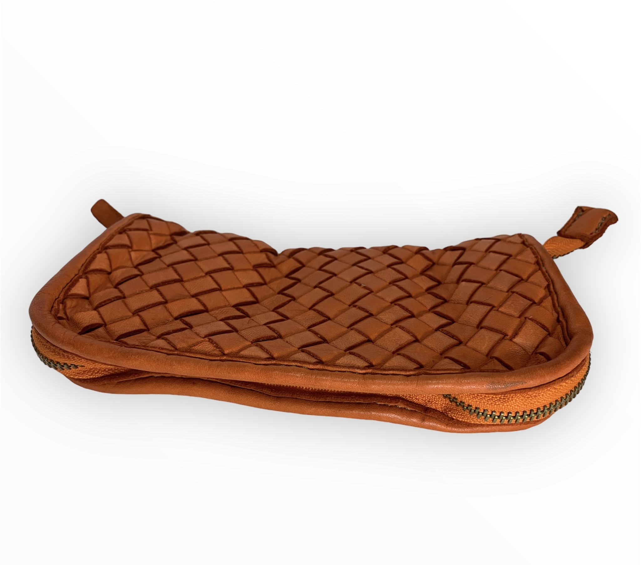 Sé el primero en valorar “Cartera billetera trenzada de piel lavada en naranja”