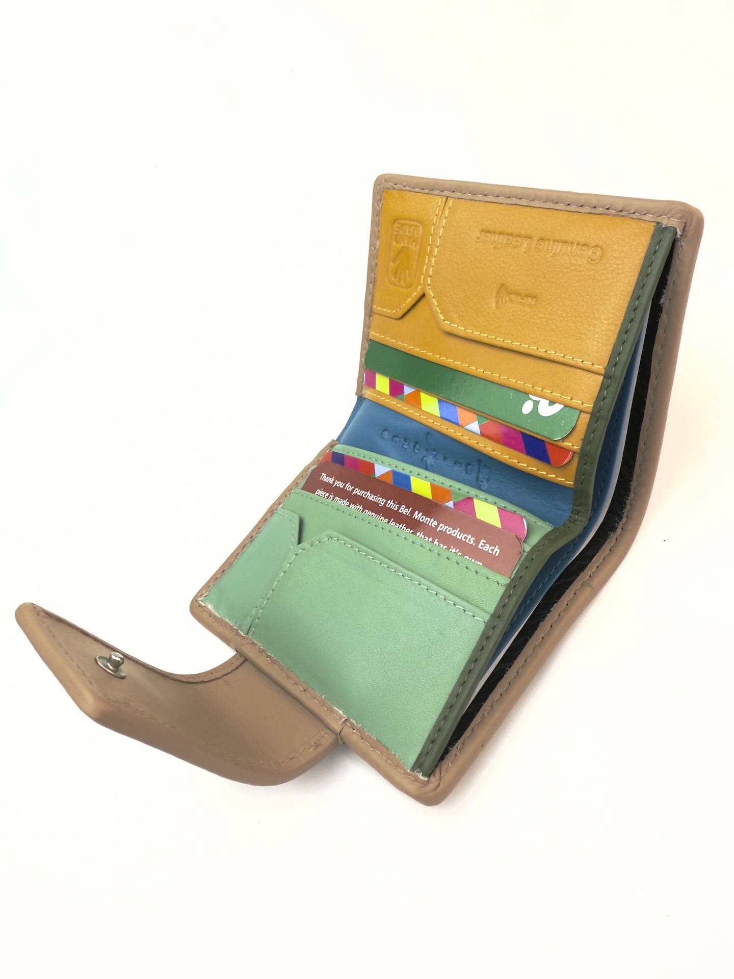 Fabricada con cuero resistente al desgaste y un tacto suave y cómodo, esta cartera no solo es práctica, sino también duradera. Su cierre con broche metálico garantiza la seguridad de tus pertenencias en todo momento.