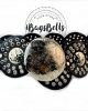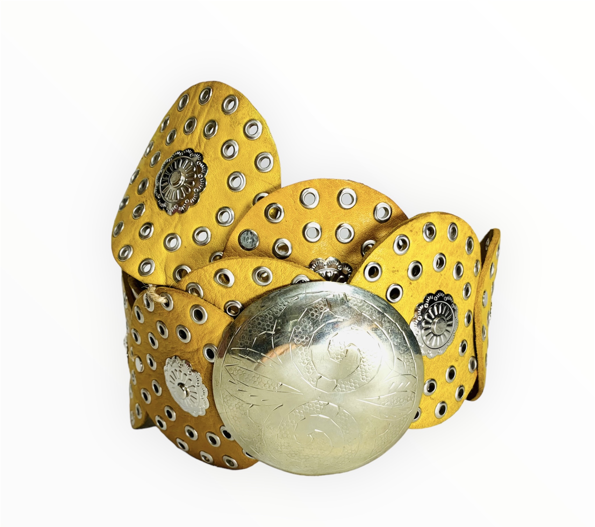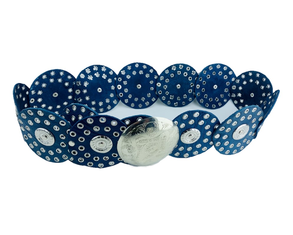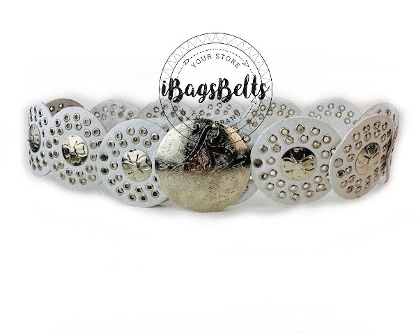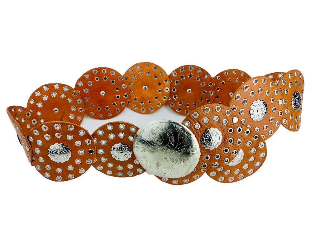 Cinturón círculos ancho con remaches y chapas de metal. Su correa de círculos decorada con remaches, hebilla en metal tallada.