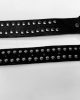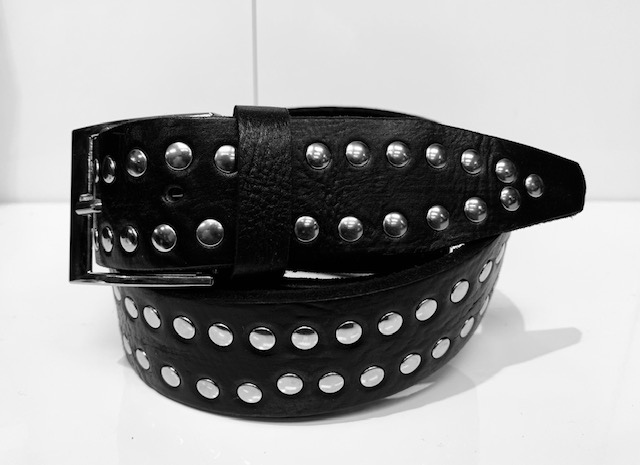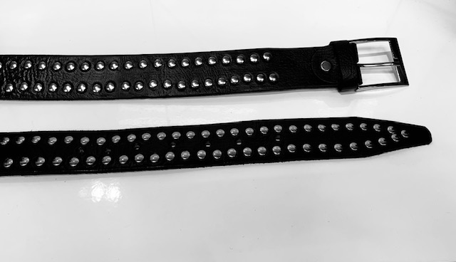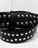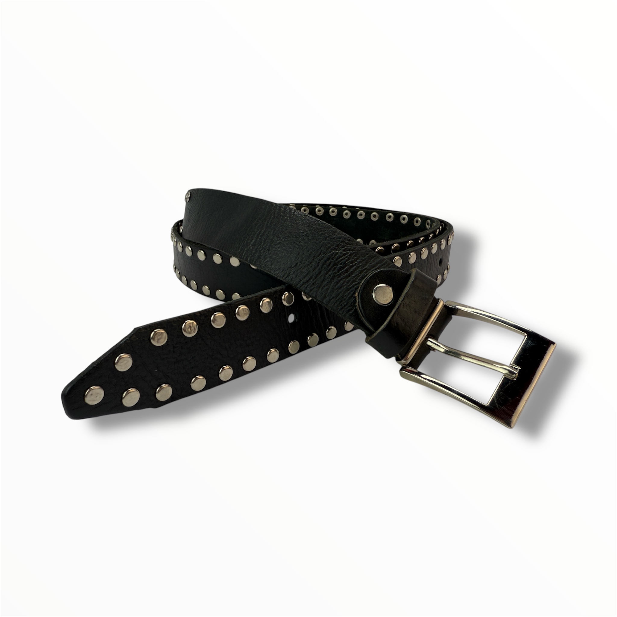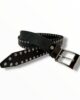 Cinturón de cuero con correa remachada, hebilla en metal.