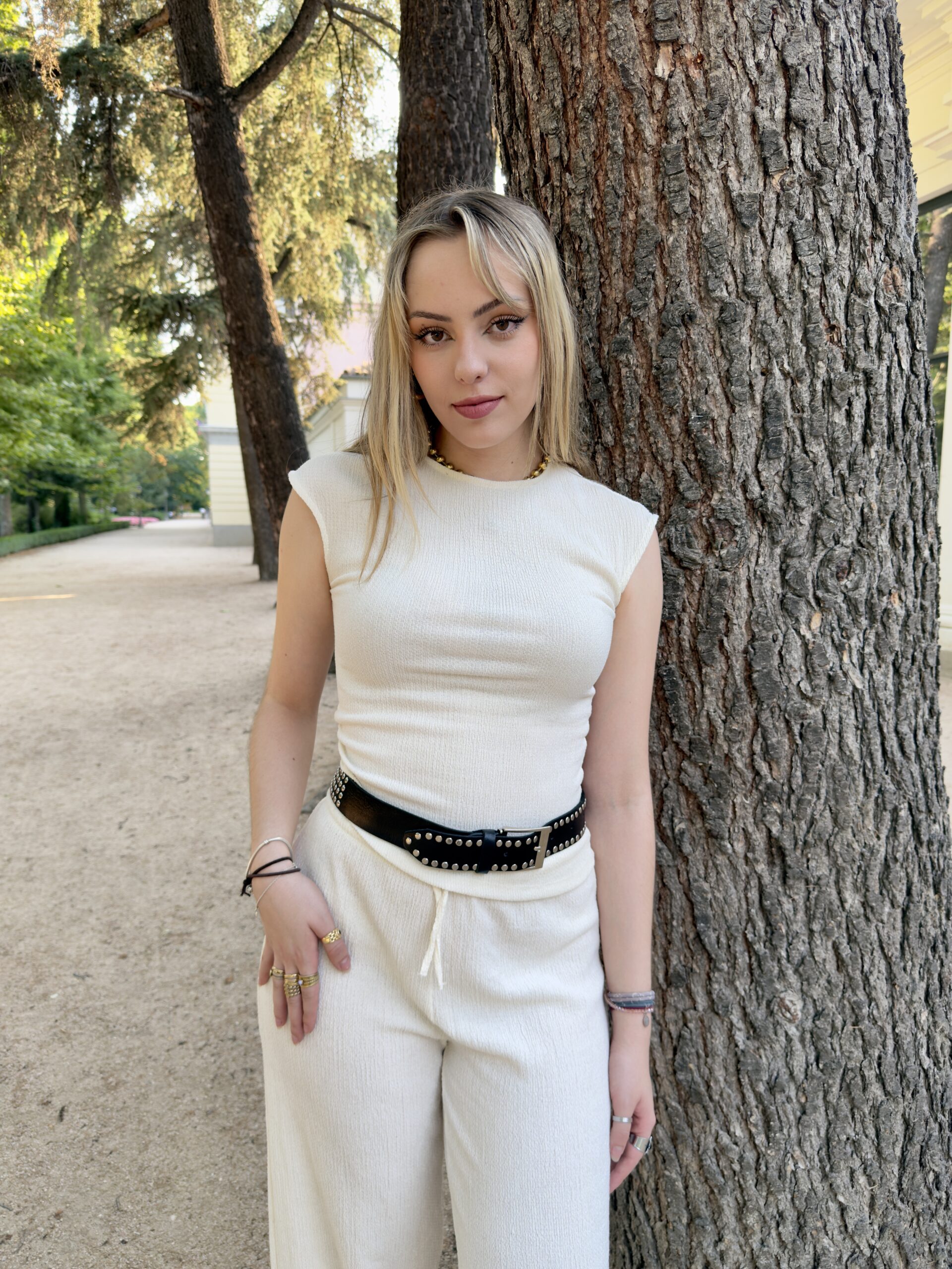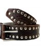 Cinturón de cuero con correa remachada, hebilla en metal.