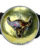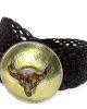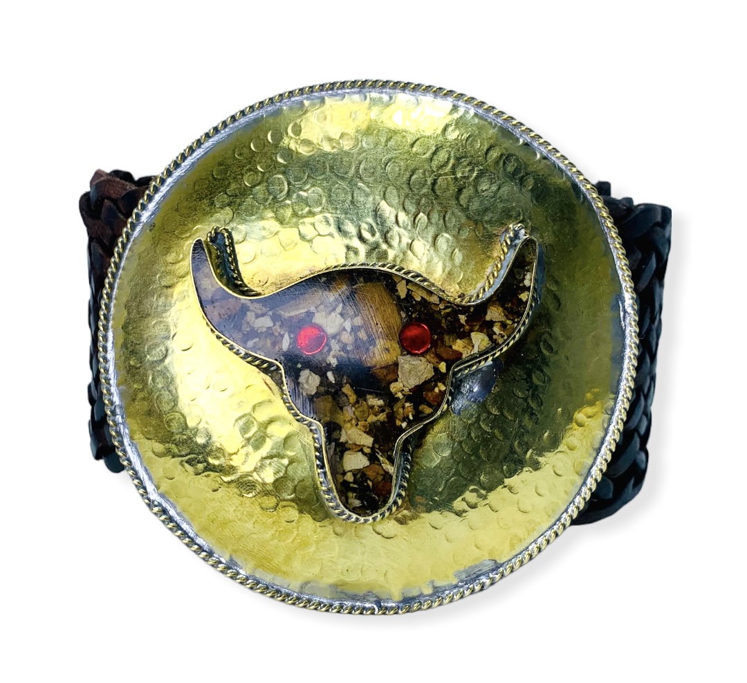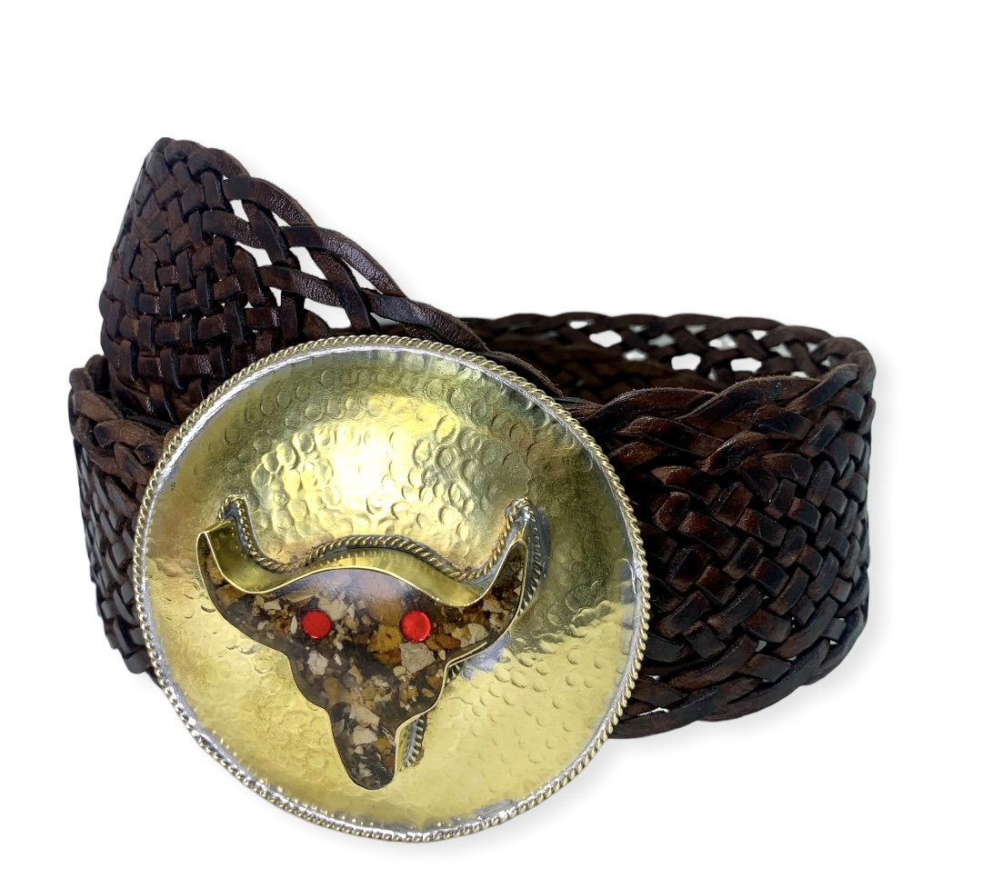 Cinturón artesanal de cuero ancho trenzado con hebilla de búfalo con incrustación realizada a mano. El cierre de hebilla plateada que puedes ajustar a tu medida, por lo que sirve para todas las tallas. Mide 7 cm de ancho y un largo máximo de 105 cm lo puedes usar en la cintura o en las caderas
