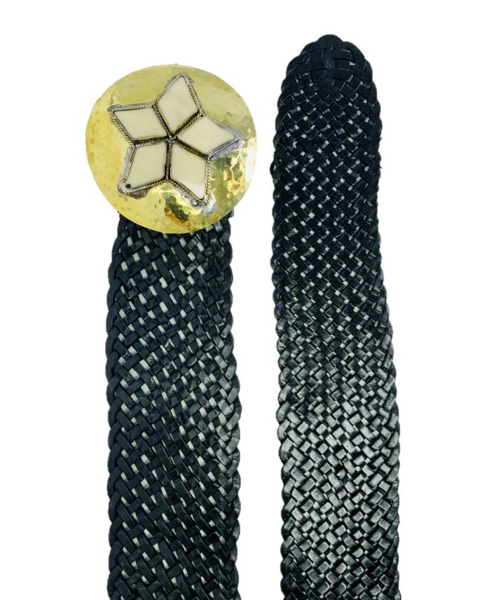 Cinturón de cuero artesanal con trenzado a mano de cuero, con hebilla de aplique artesanal en forma de estrella en la parte central que lo trasforman en el complemento ideal para tu outfit.