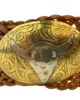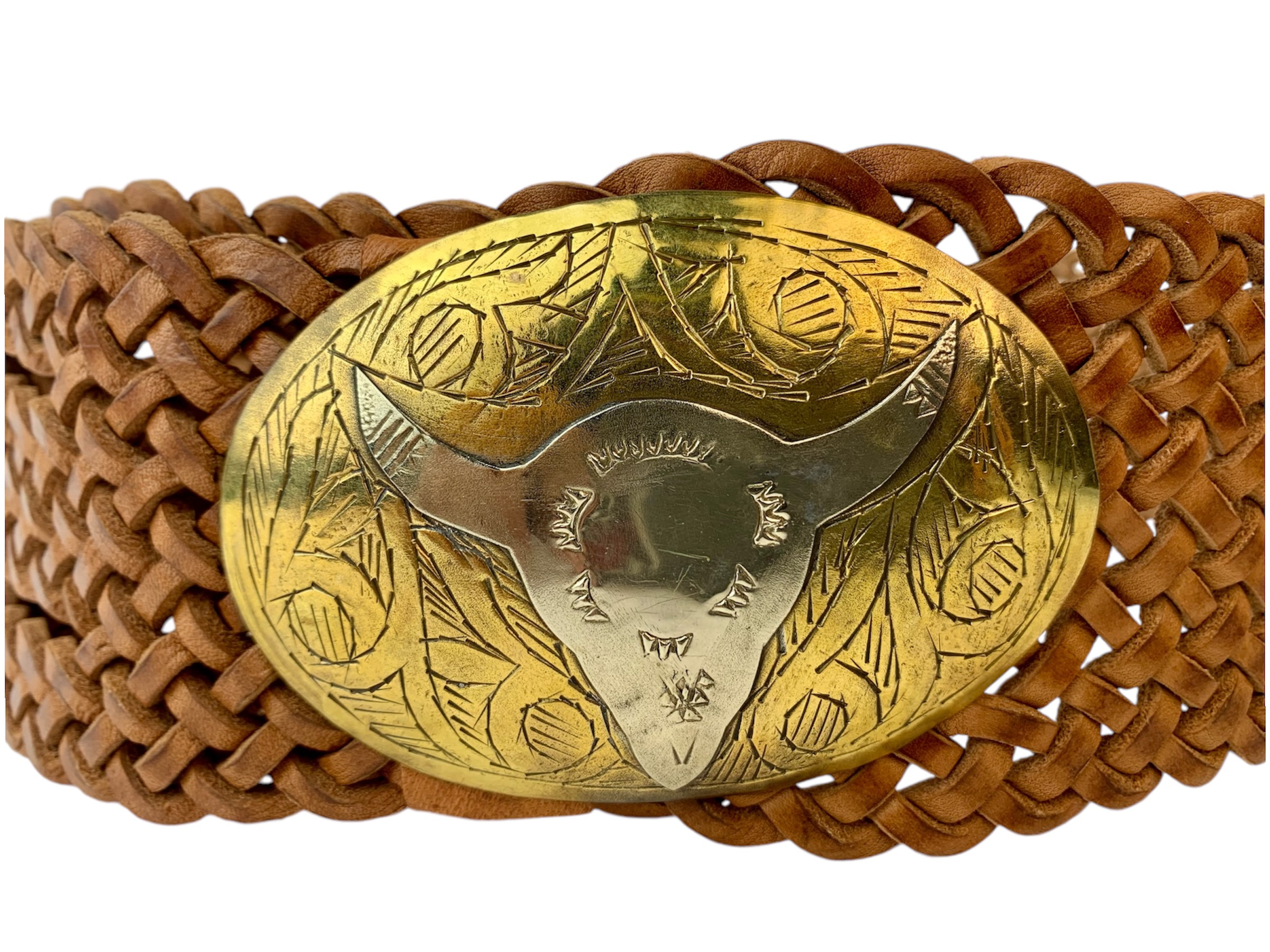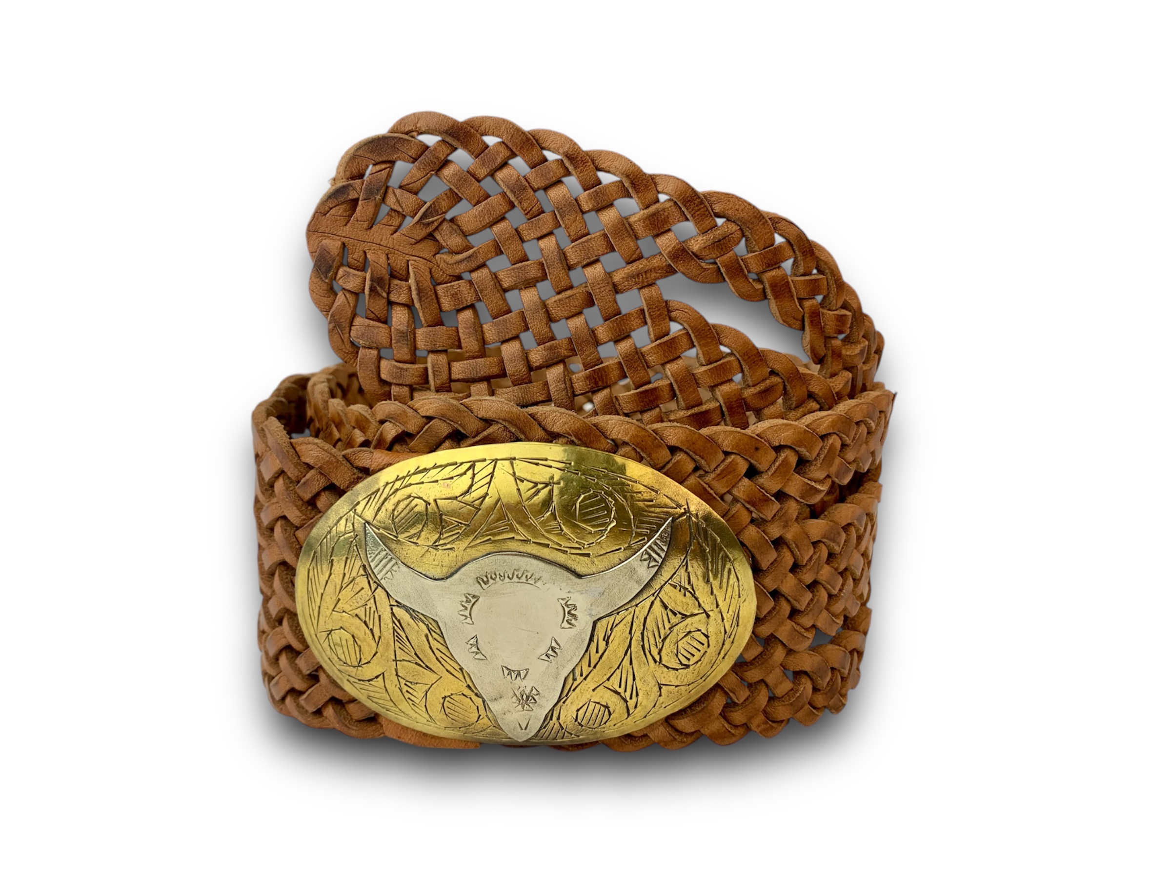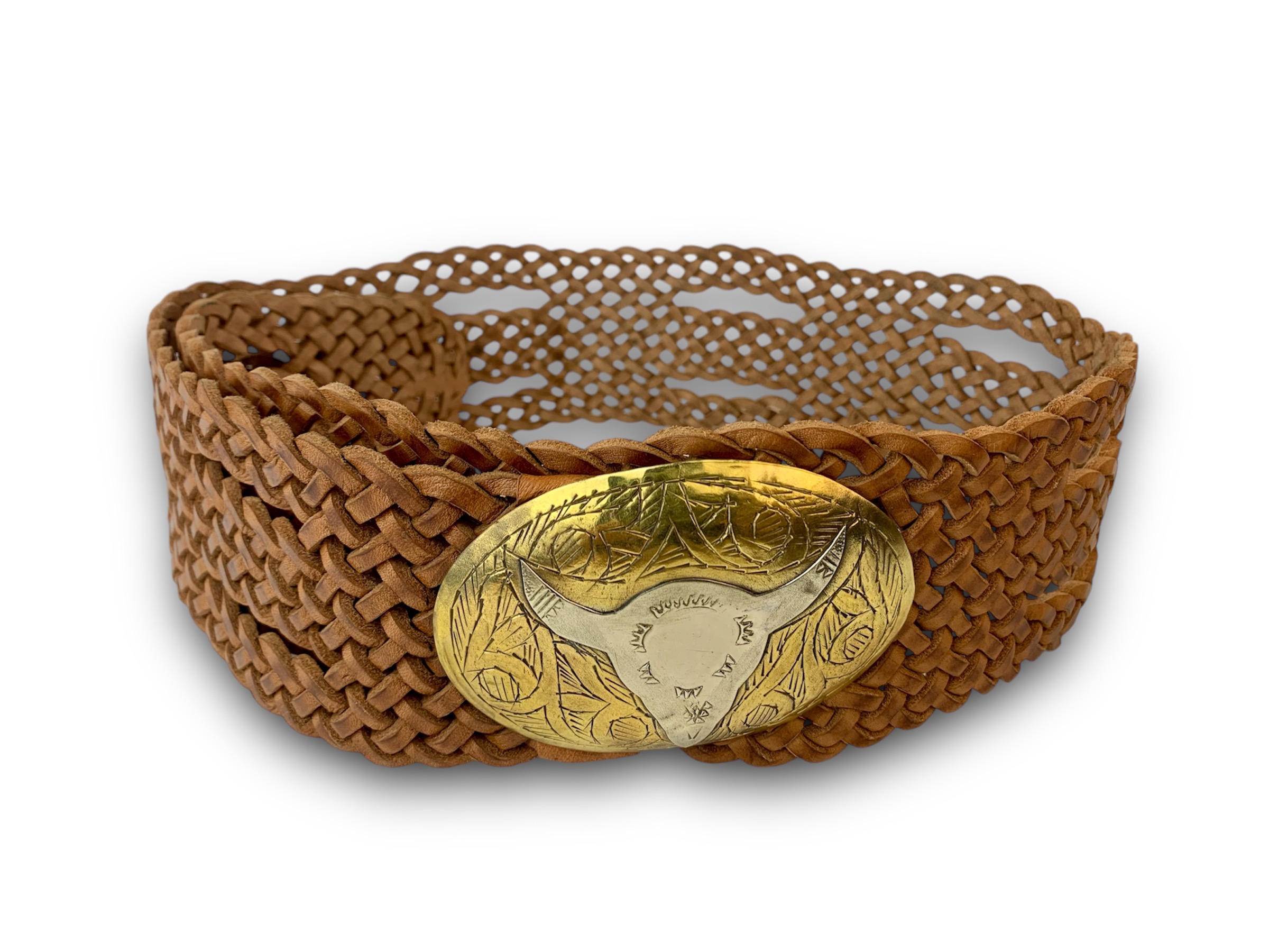 Cinturón de cuero artesanal con trenzado a mano de cuero con hebilla ovalada con silueta de búfalo con una