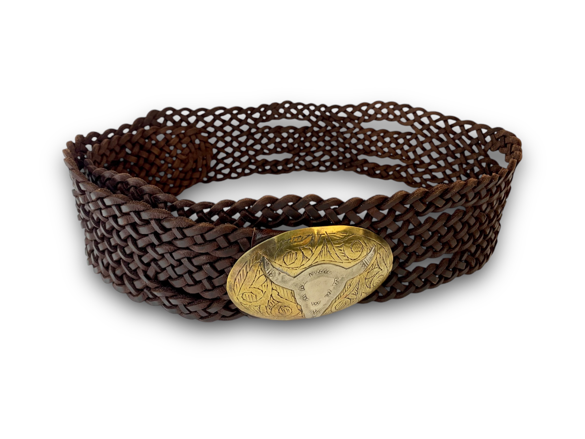 Cinturón de cuero trenzado marrón con hebilla ovalada búfalo