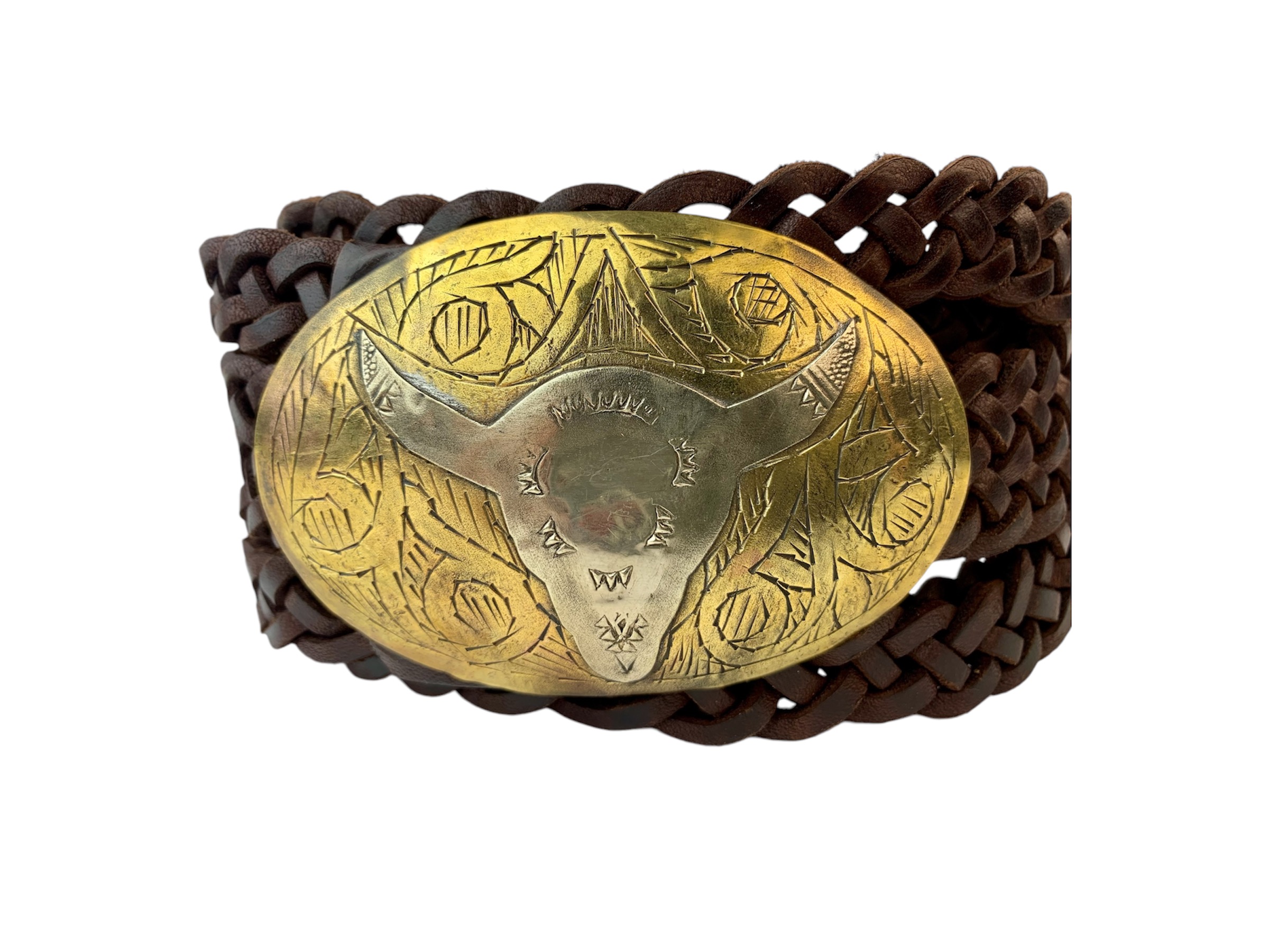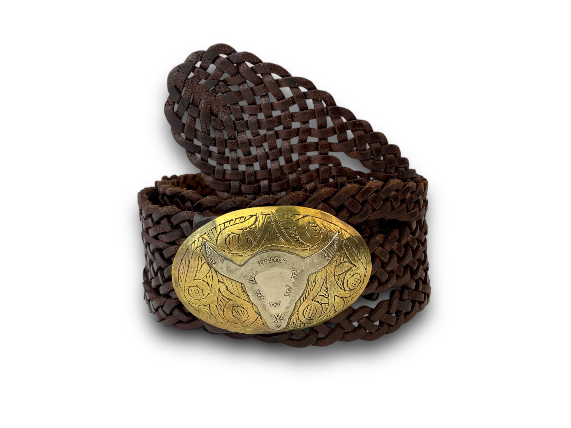 Cinturón de cuero artesanal con trenzado a mano  de cuero con hebilla ovalada con silueta de búfalo con una