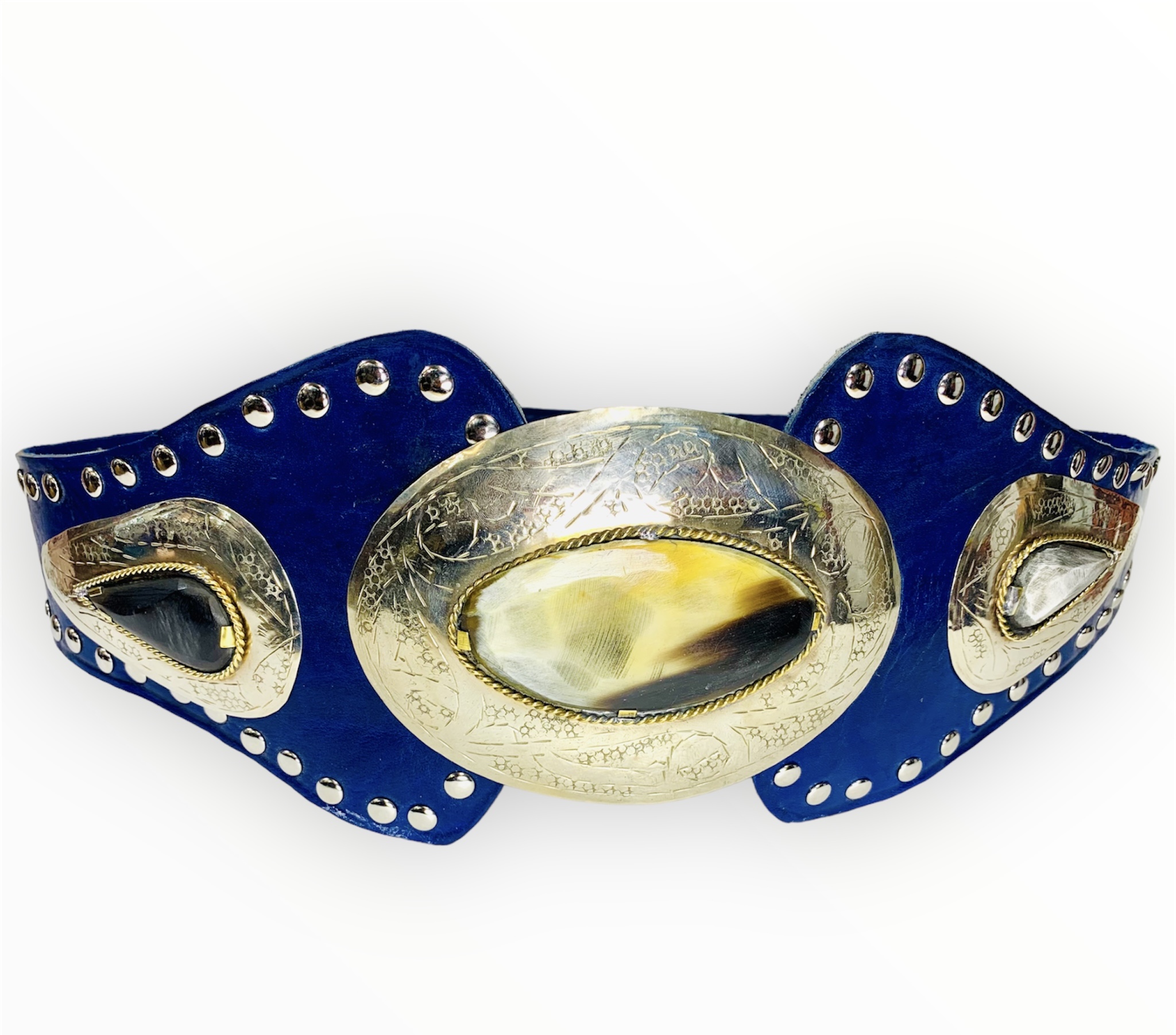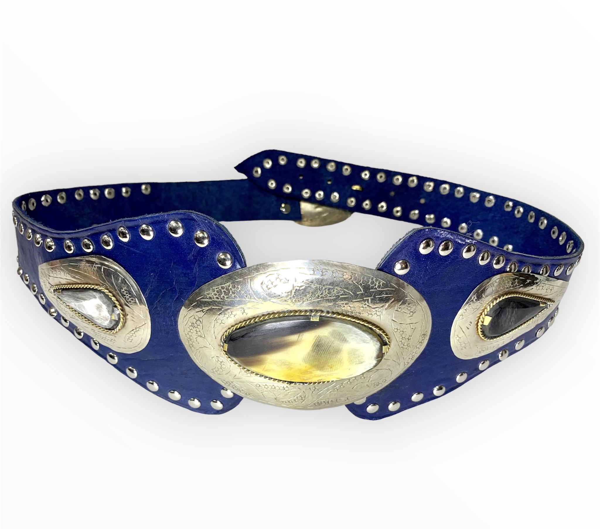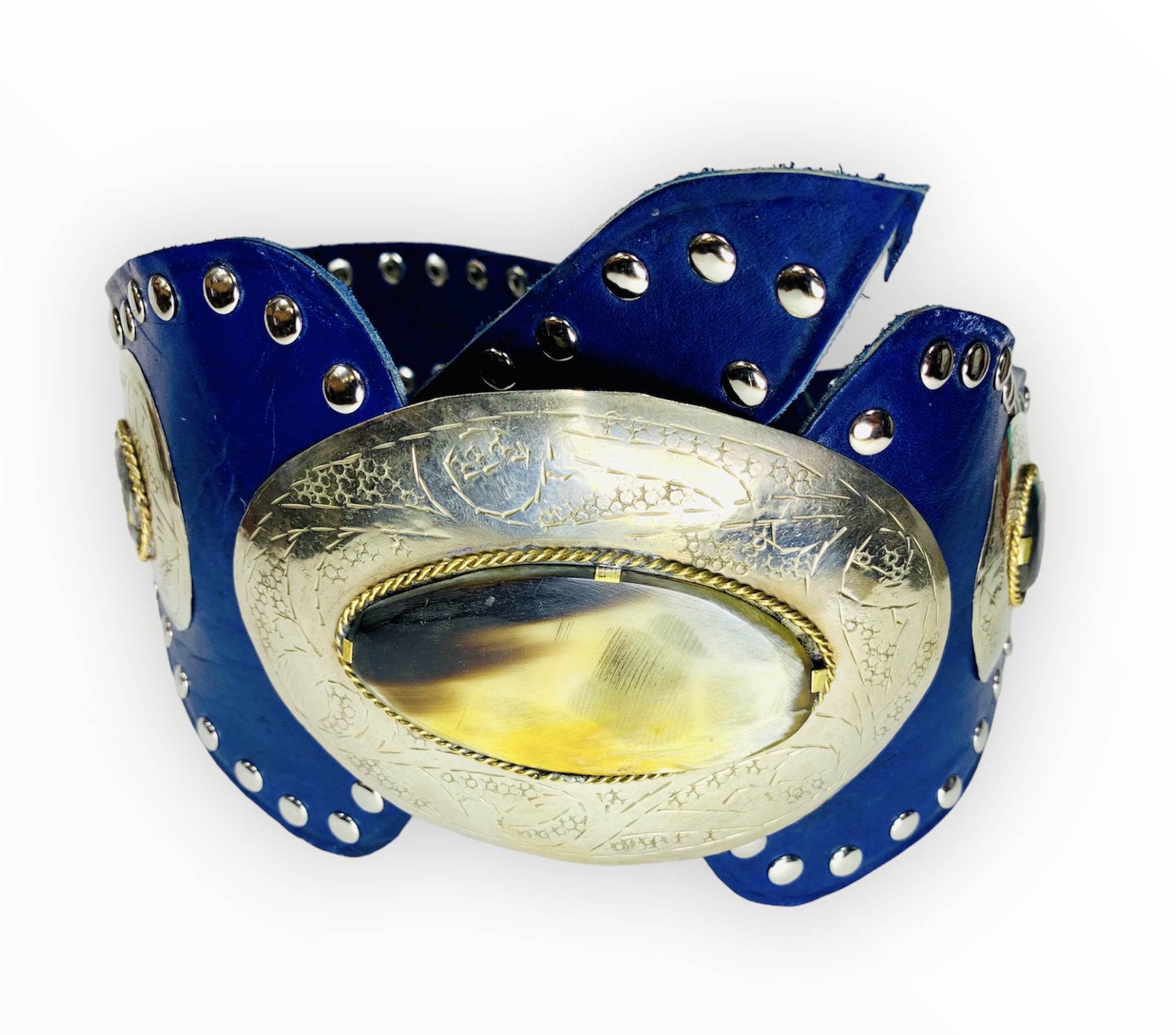 Fajín ancho, Cinturón de cuero con remaches estilo boho. Con decoración de remaches y chapas de alpaca con hueso en la parte central de cada una fabricado todo a mano.
