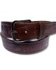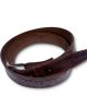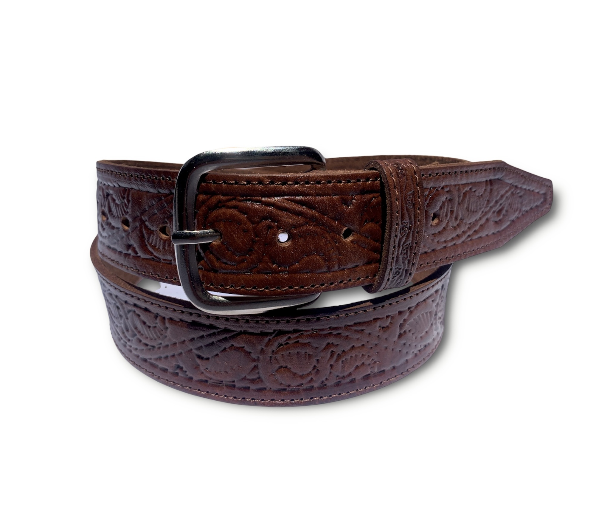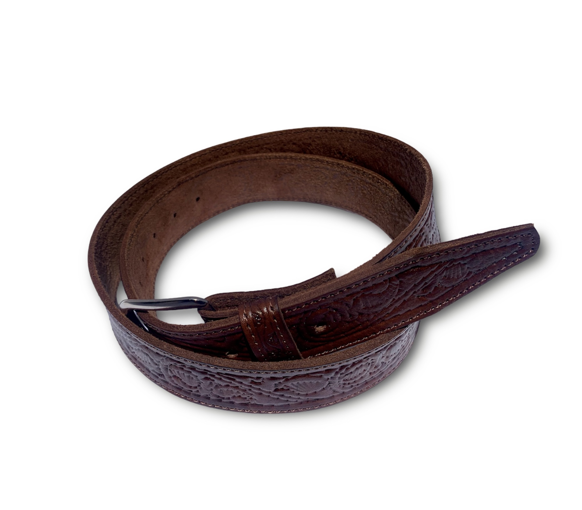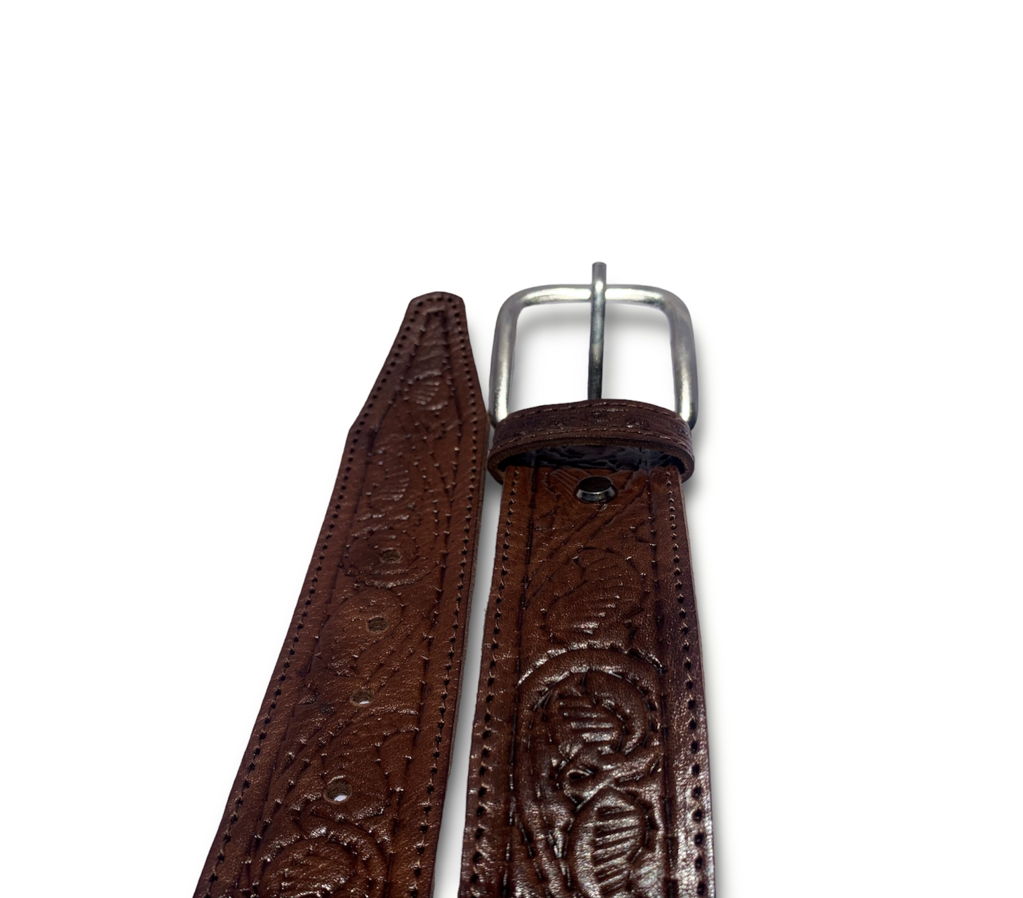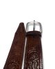 El cinturón hecho en cuero envejecido sin forro. estampado a maquina con tintes antiguos y luego tallado a mano con un diseño floral clásico del oeste, también se muestra la costura a lo largo del cinturón. Para la costura utilizamos un hilo resistente y refinado por mercerización. Gracias a la tapa de rosca, el cinturón también se puede acortar individualmente.