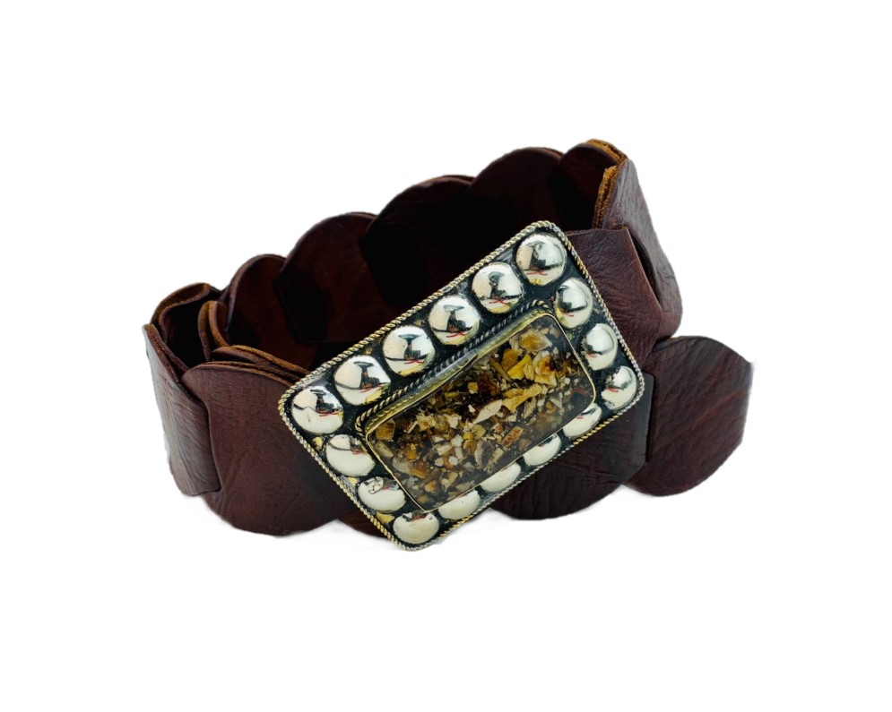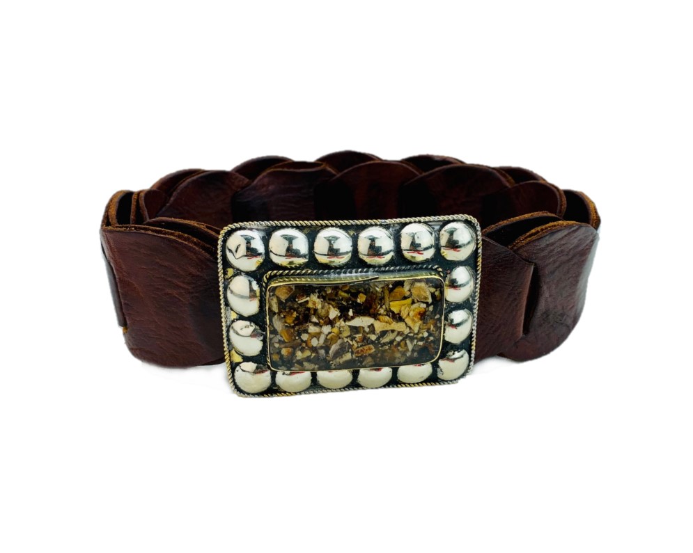 Este cinturón de cuero con correa trenzada y hebilla de metal es un accesorio versátil y elegante, ideal para complementar cualquier outfit con un toque de estilo distintivo.