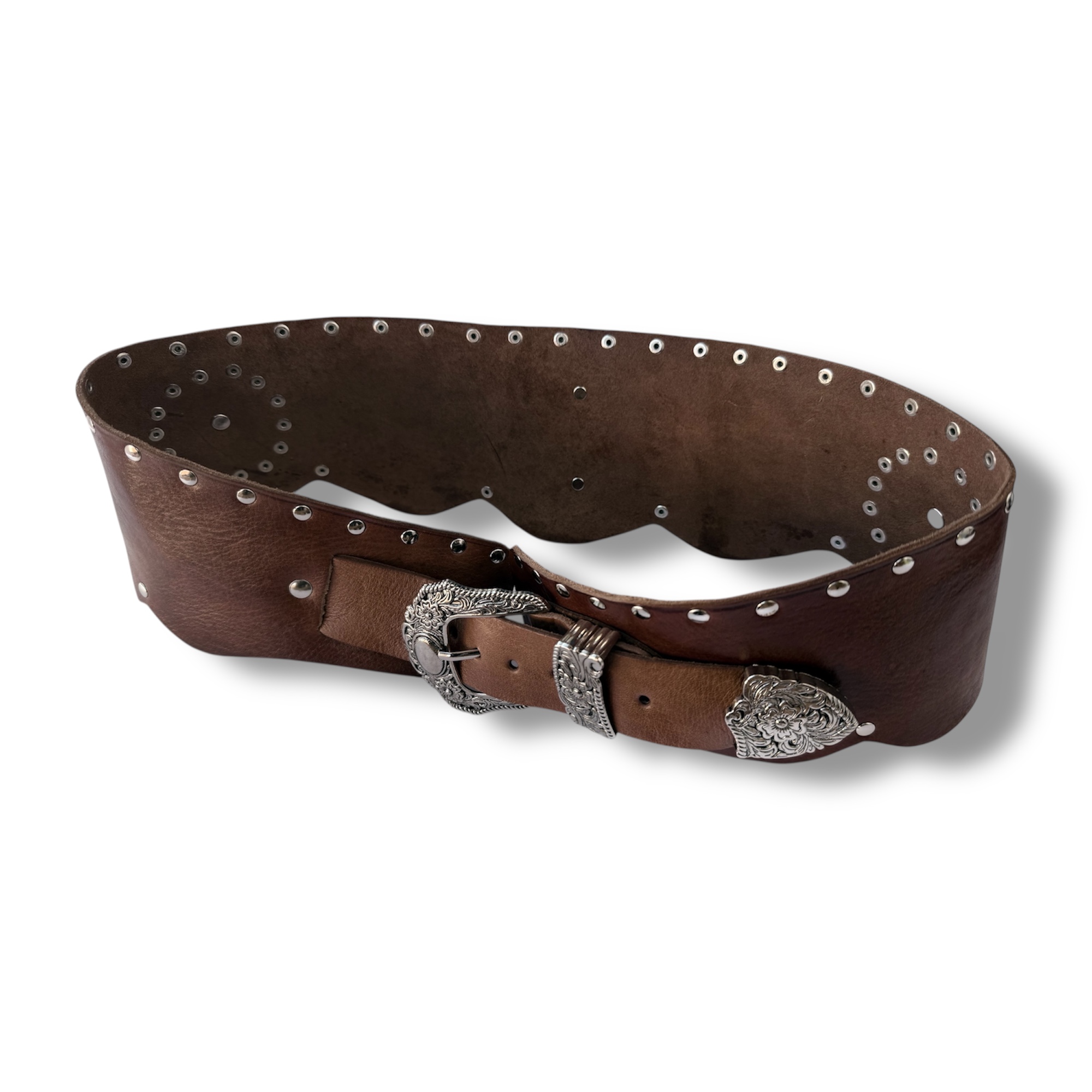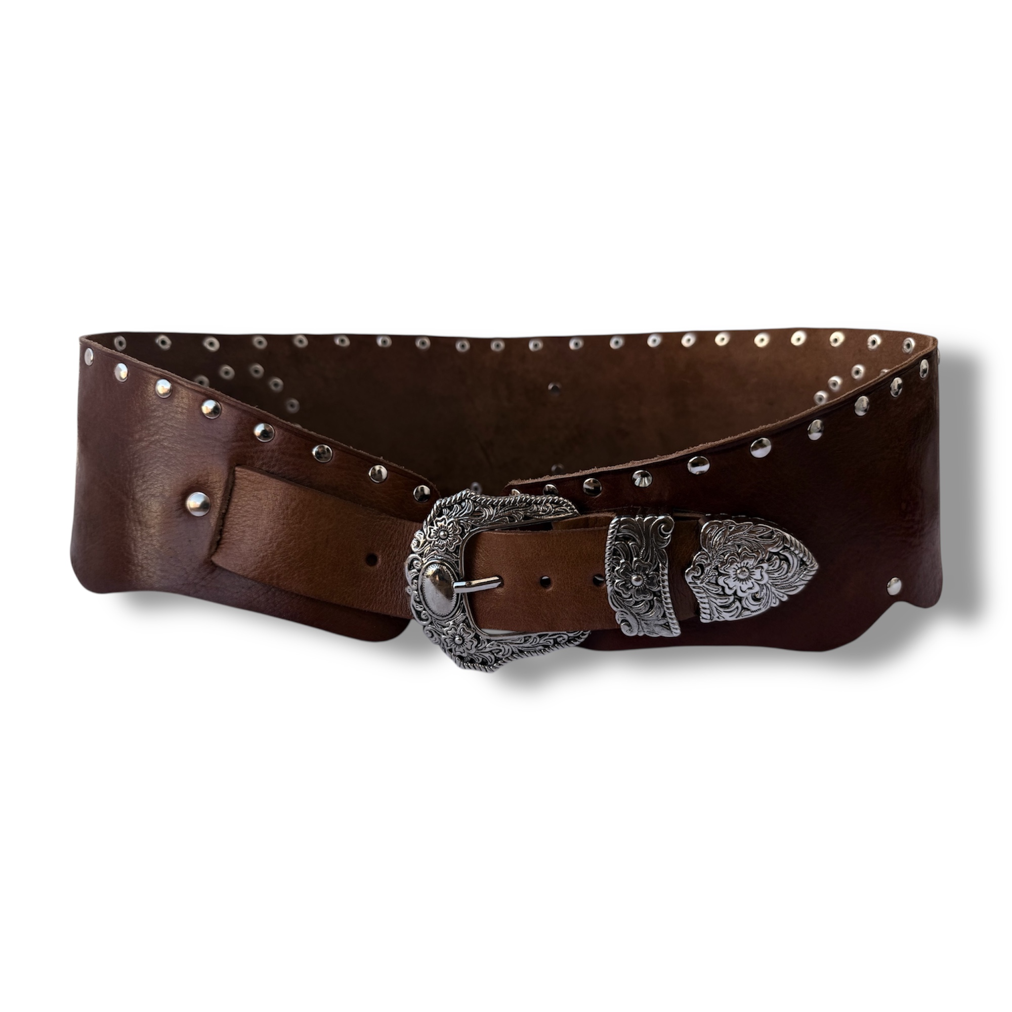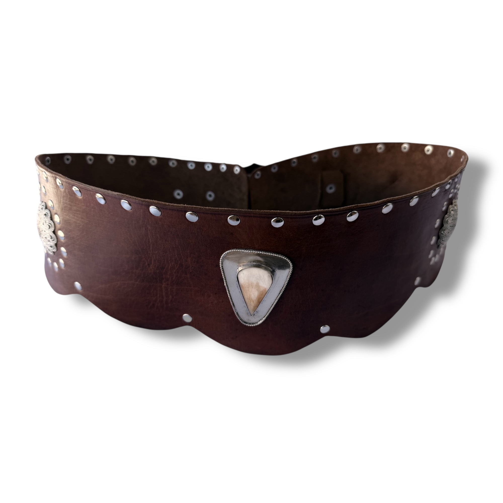 Fajín ancho, Cinturón de cuero con remaches estilo bohemio. Con decoración de remaches y chapa de alpaca con asta en forma de gota. Cada un de ellos están fabricado todo a mano.