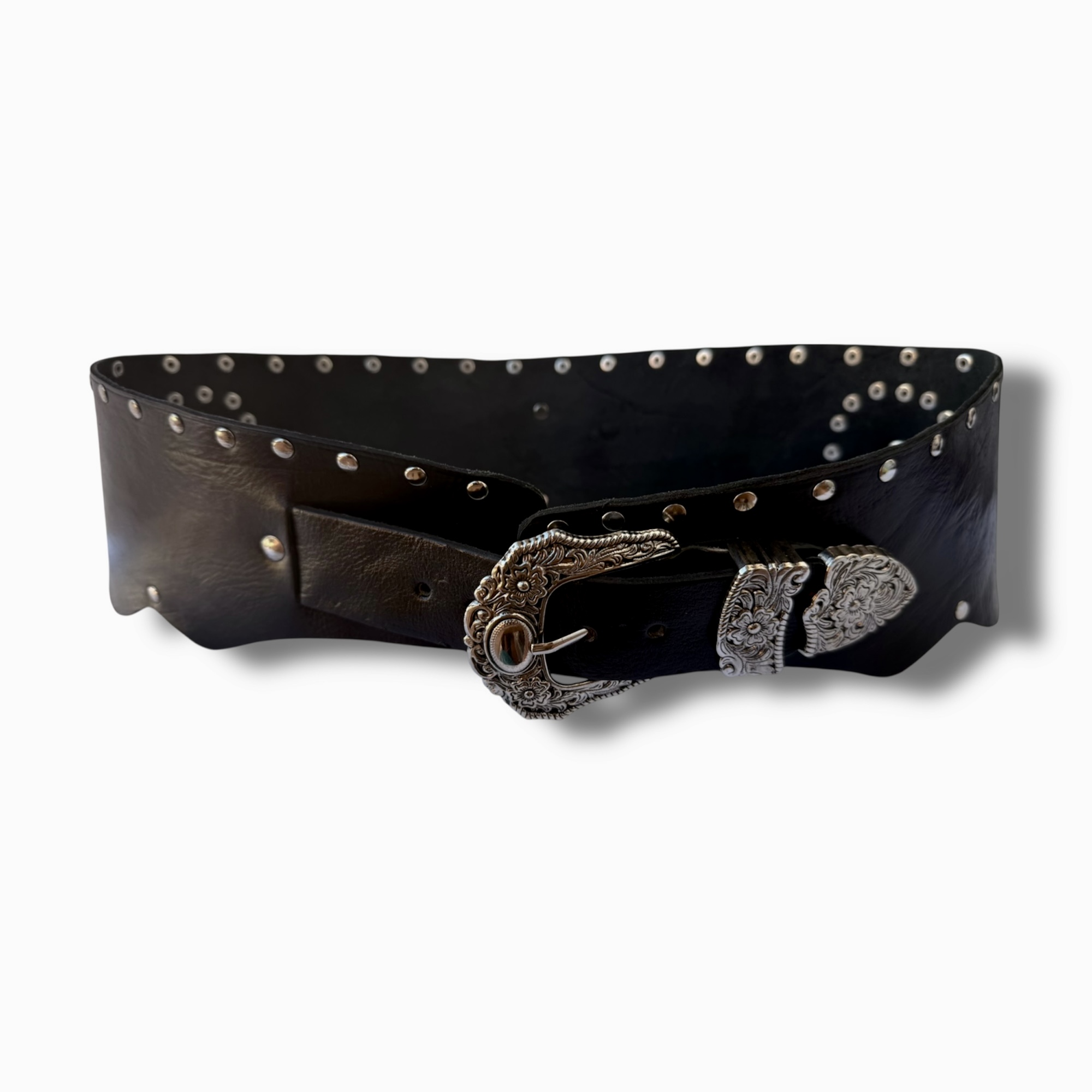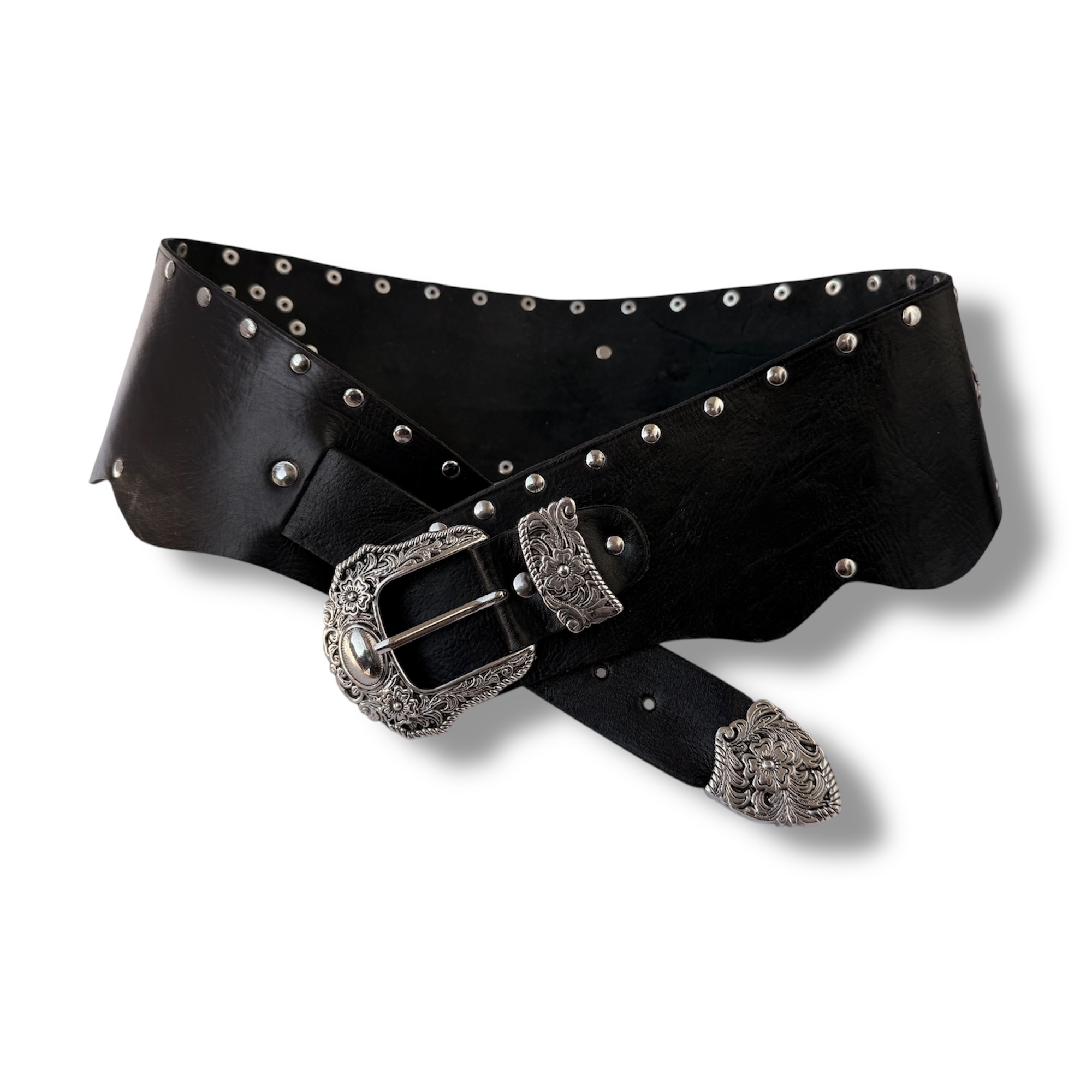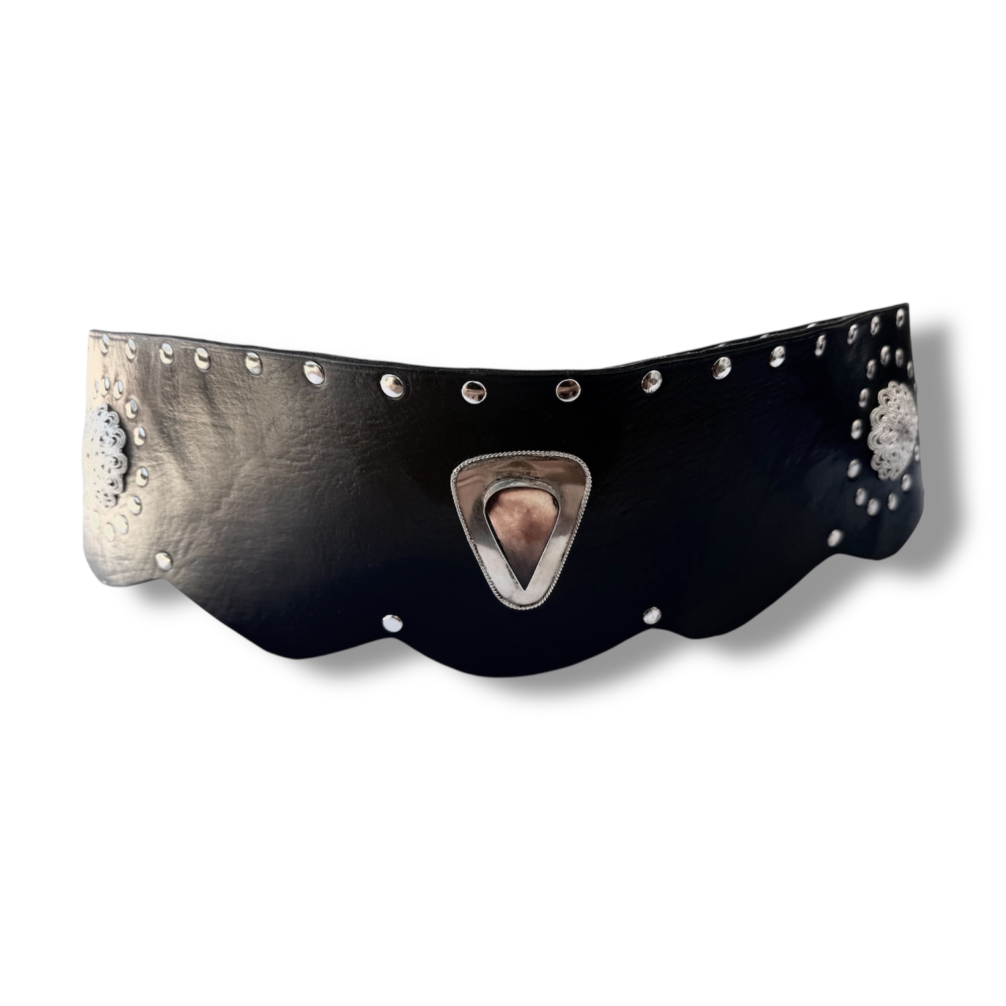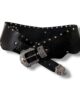Fajín ancho, Cinturón de cuero con remaches estilo bohemio. Con decoración de remaches y chapa de alpaca con asta en forma de gota. Cada un de ellos están fabricado todo a mano.