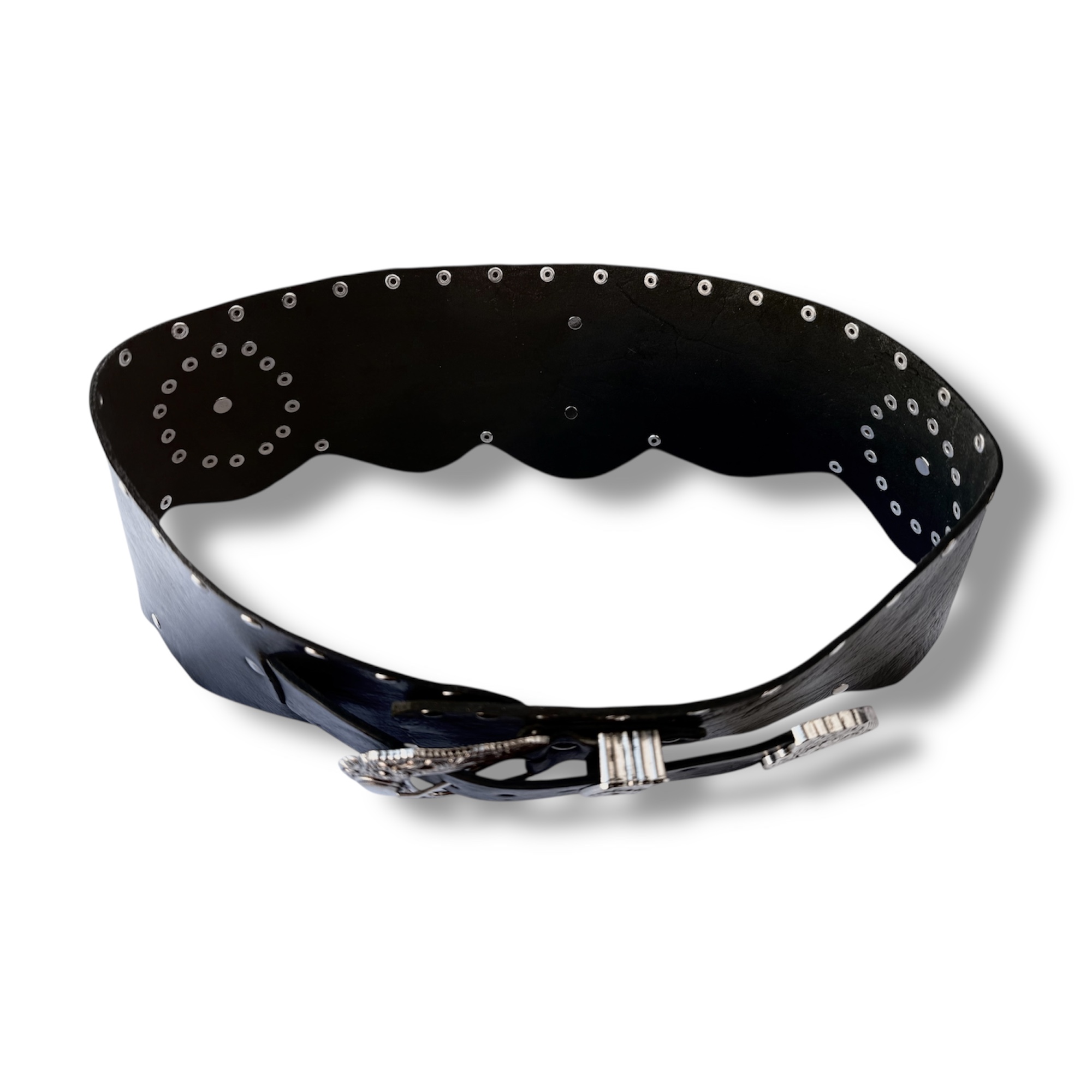 También con una fila de tachas  por todo el, que combina el cuero liso con las tachas plateadas dándole un estilo cowboy