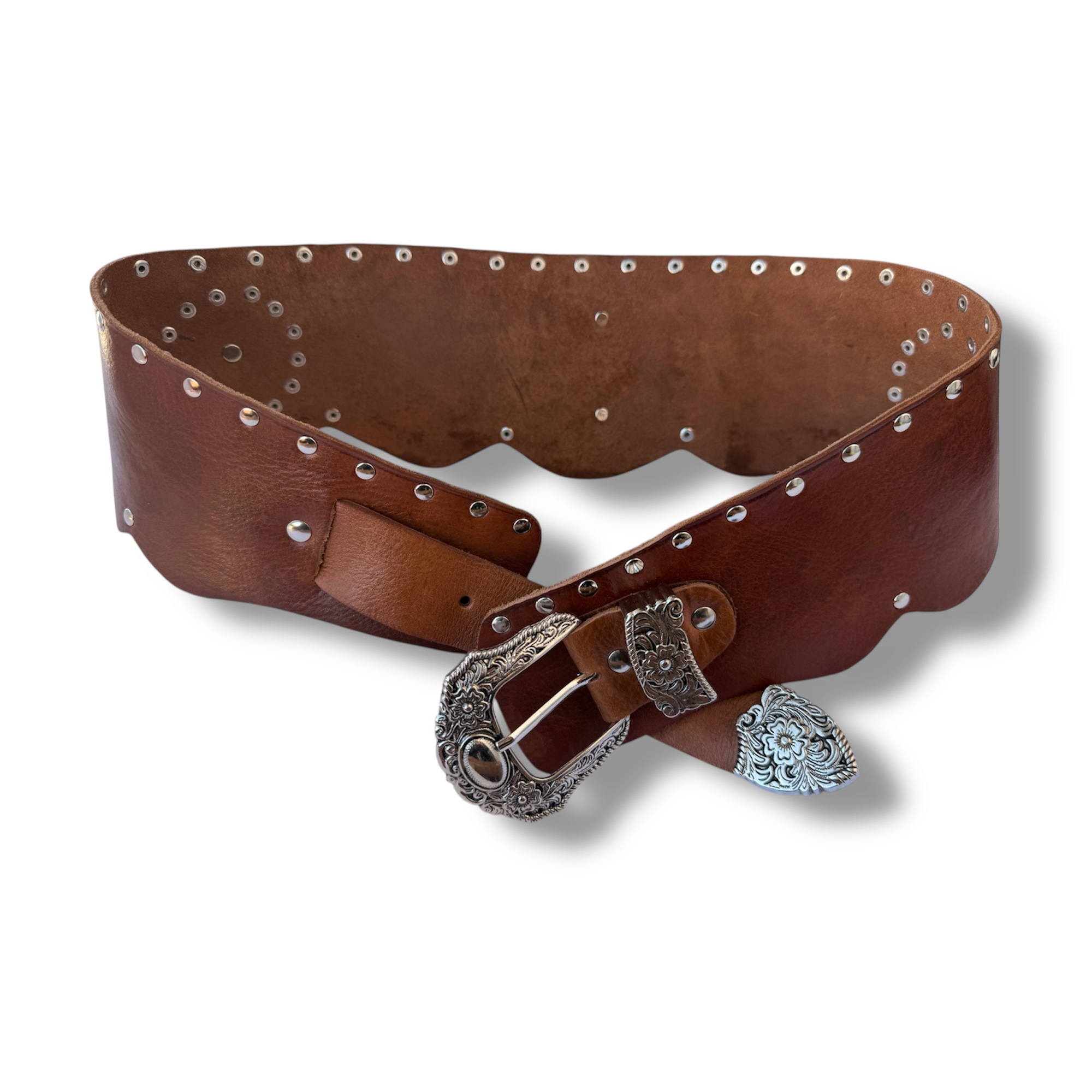 Fajín ancho, Cinturón de cuero con remaches estilo bohemio. Con decoración de remaches y chapa de alpaca con asta en forma de gota. Cada un de ellos están fabricado todo a mano.