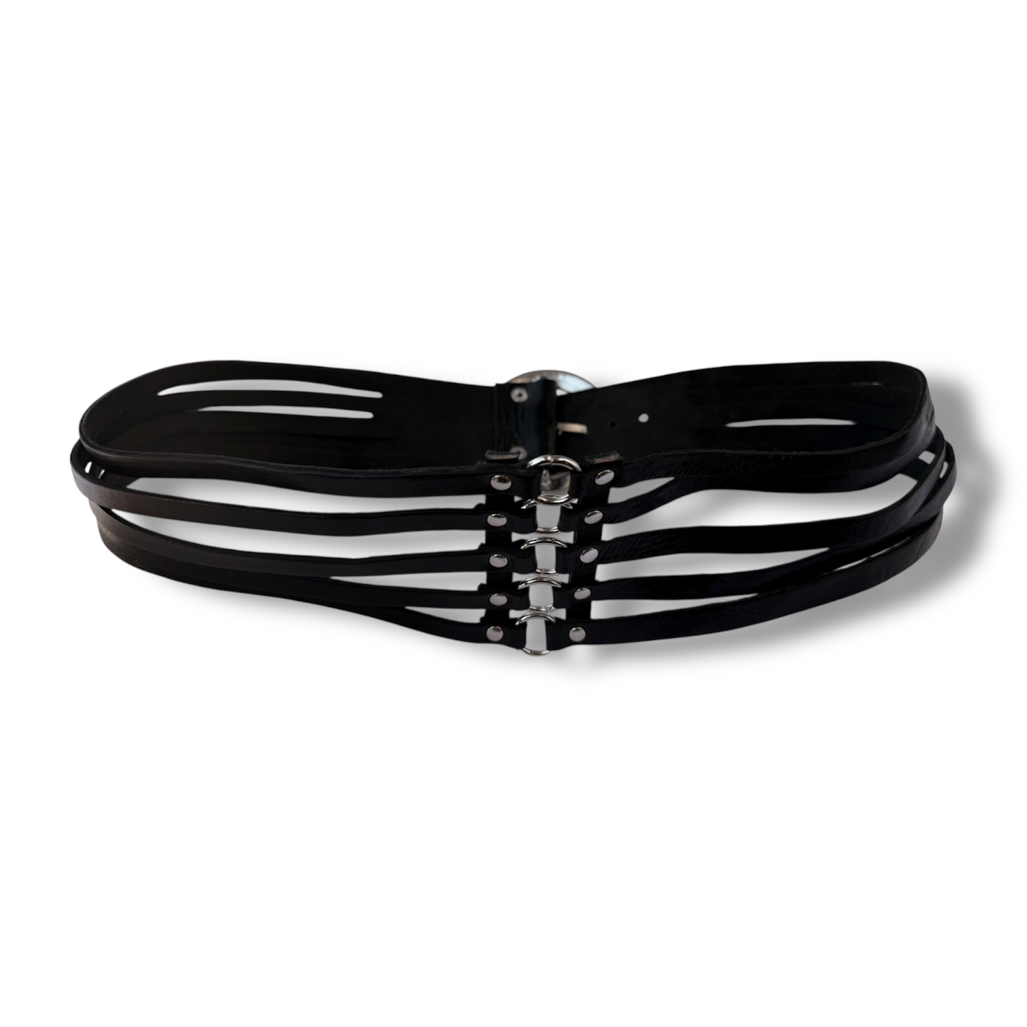 Destaca tu estilo con nuestro fajín ancho de cuero, una pieza única hecha a mano y cortada en cinco tiras para añadir un toque distintivo a tu look. Confeccionado con cuero de la más alta calidad y un cierre de hebilla de metal de forma redonda, este fajín es la opción perfecta para resaltar tu cintura y lucir tu vestido favorito con elegancia y sofisticación.