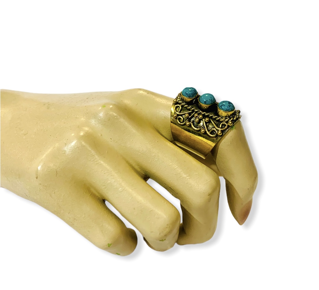 Maxi anillo bohemio con un original diseño en tono dorado envejecido oscurecido, un anillo con relieve y tres piedras incrustadas turquesas, que por su originalidad no pasará inadvertido… ¿Te atreves tú también a llevarlo?