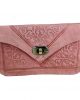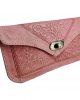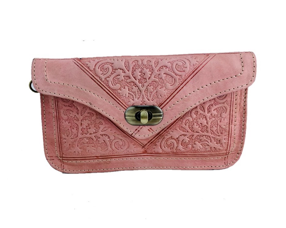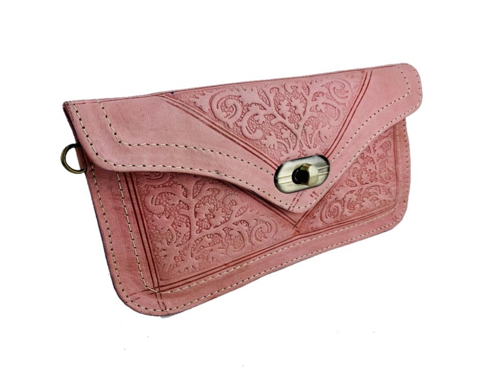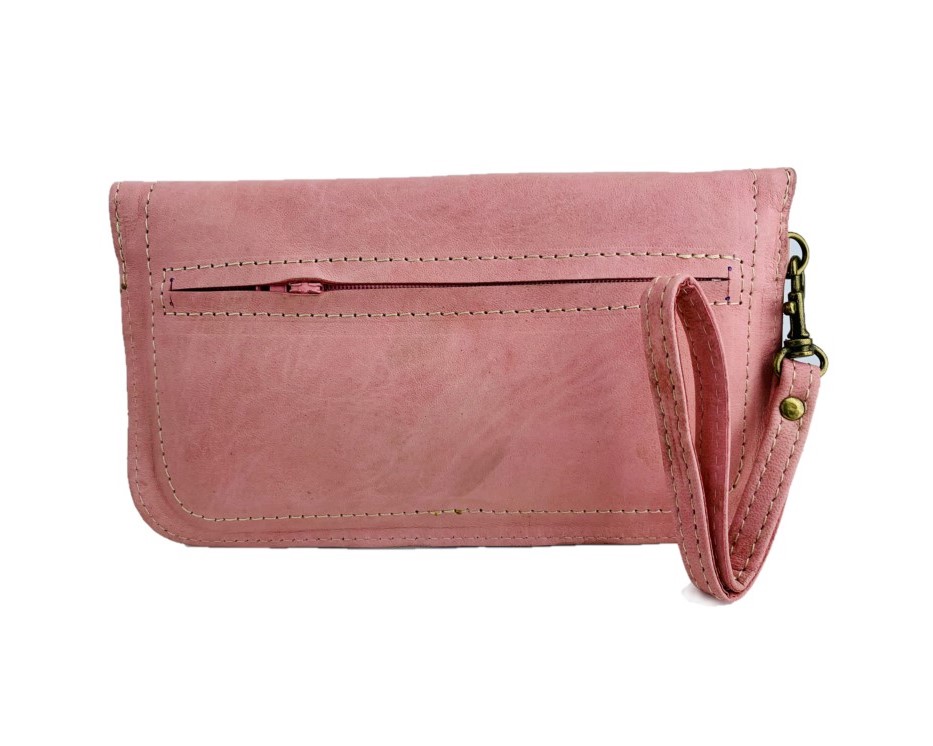 Este encantador monedero de cuero, con su distintivo estampado artesanal en tono rosa, es la combinación perfecta de estilo y funcionalidad. A pesar de su tamaño mediano, ofrece un amplio espacio para llevar todo lo que necesitas en tu día a día, desde monedas hasta tarjetas y billetes.