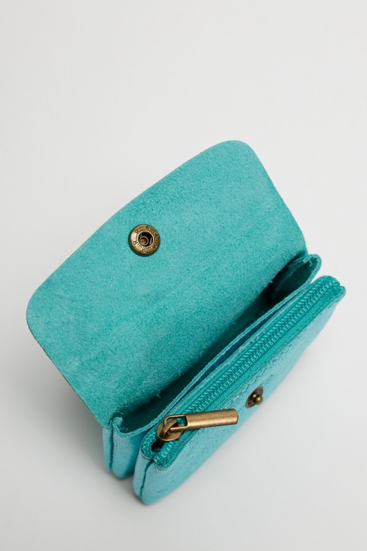Con su tamaño compacto, este monedero es ideal para llevarlo contigo en tus salidas diarias, ya sea en tu bolso o simplemente en la mano. ¡Destaca con estilo y funcionalidad con nuestro monedero mini de piel metalizado en turquesa!