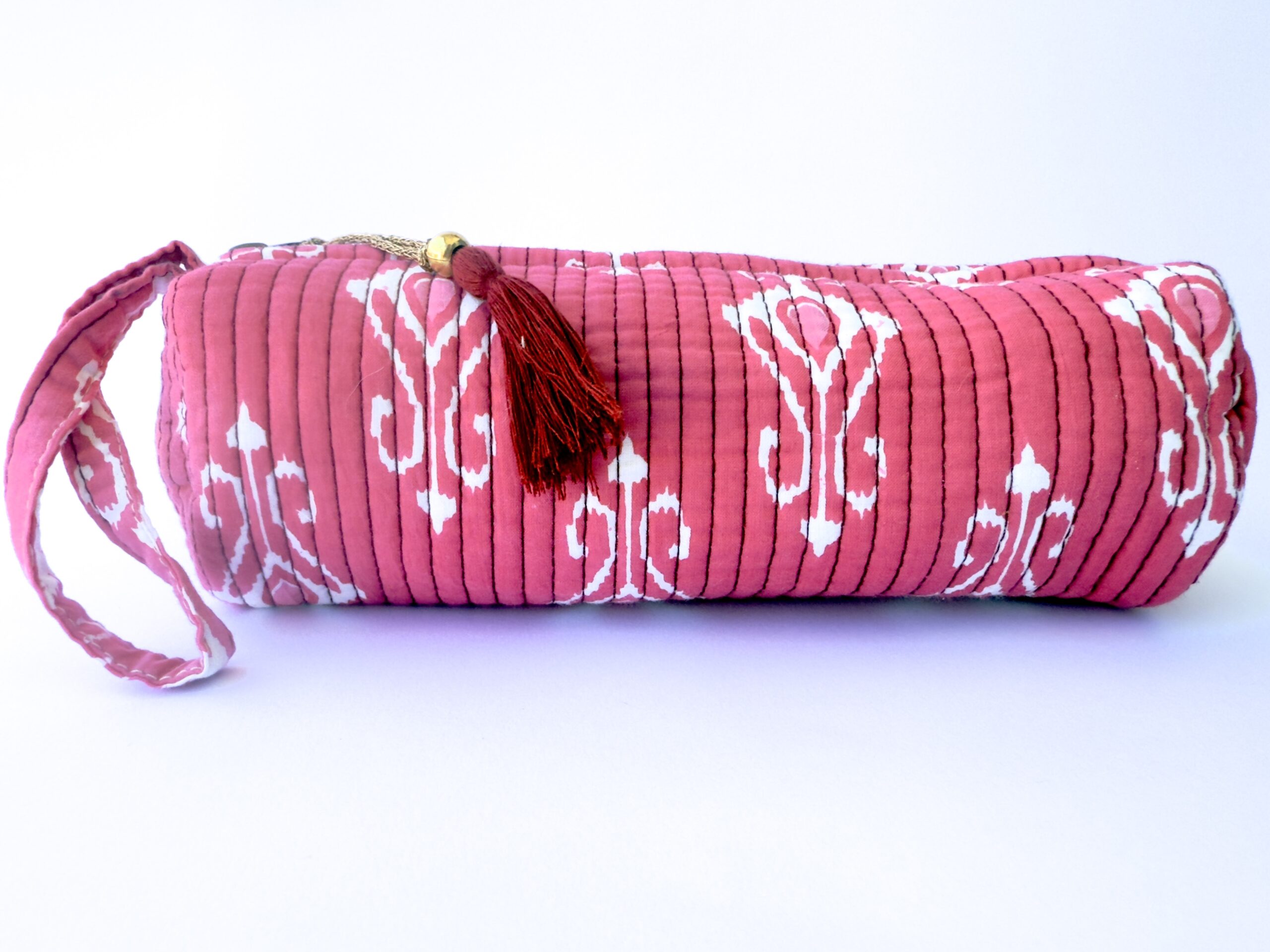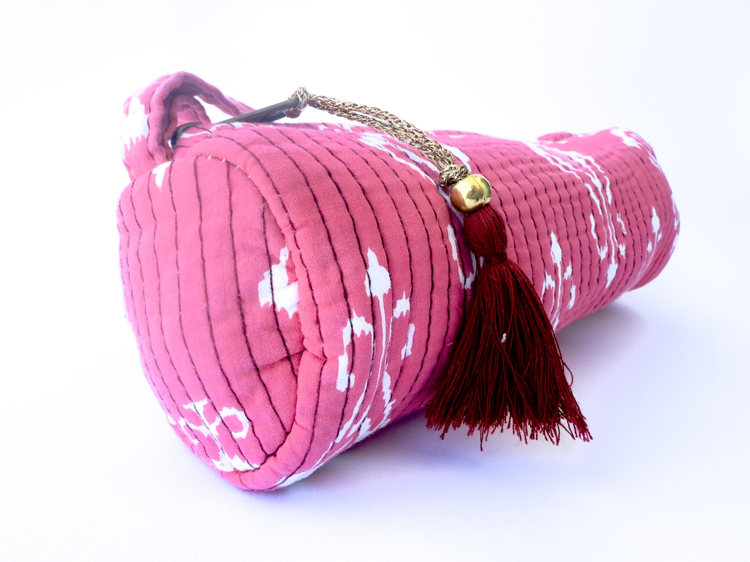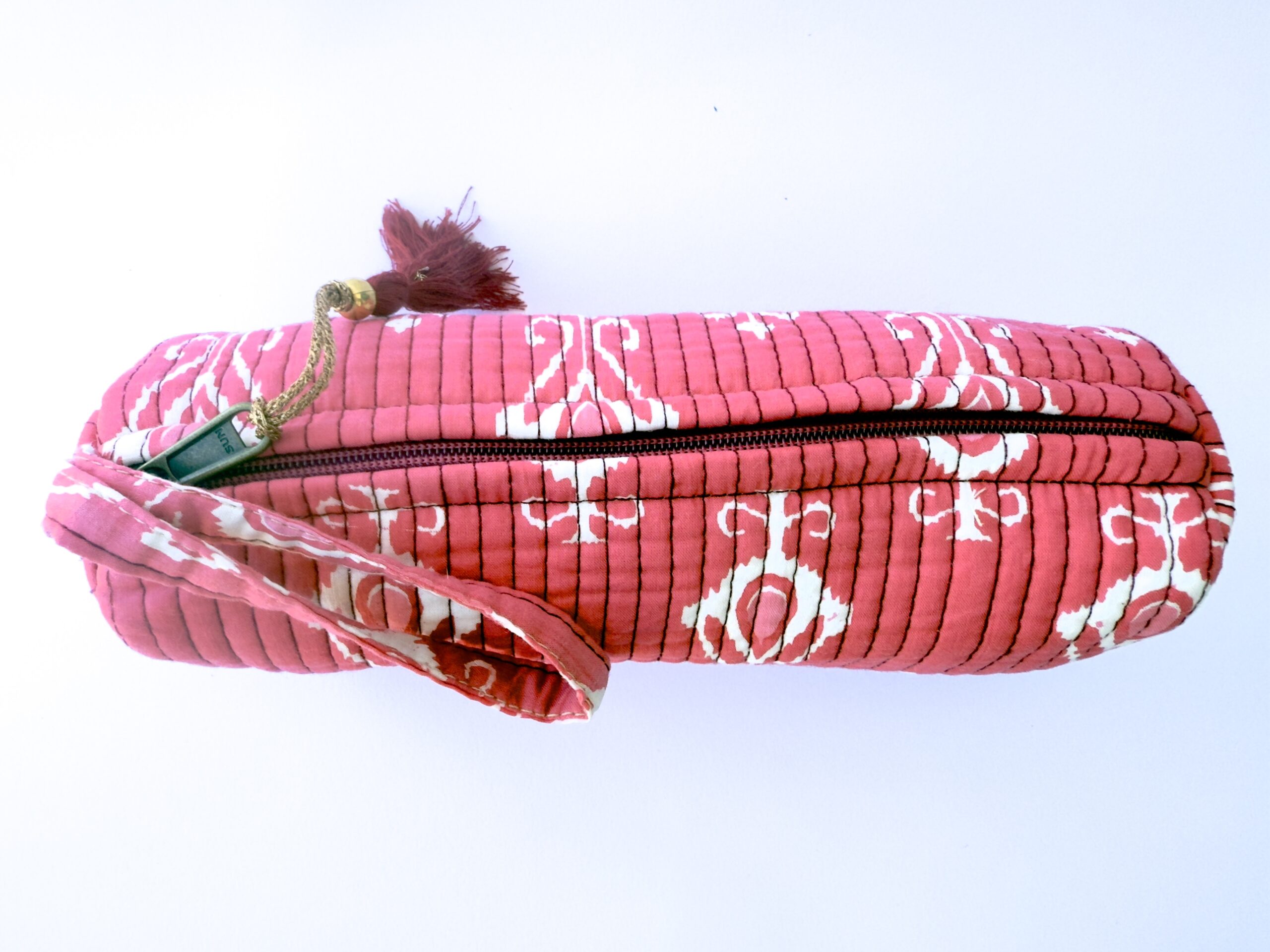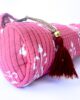 Incluye cierre de cremallera con cinta dorada y borla decorativa en flecos burdeos, además de una práctica cinta lateral para sujetarlo o colgarlo fácilmente. Su interior va forrado en tela beige para mayor protección.