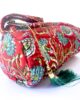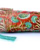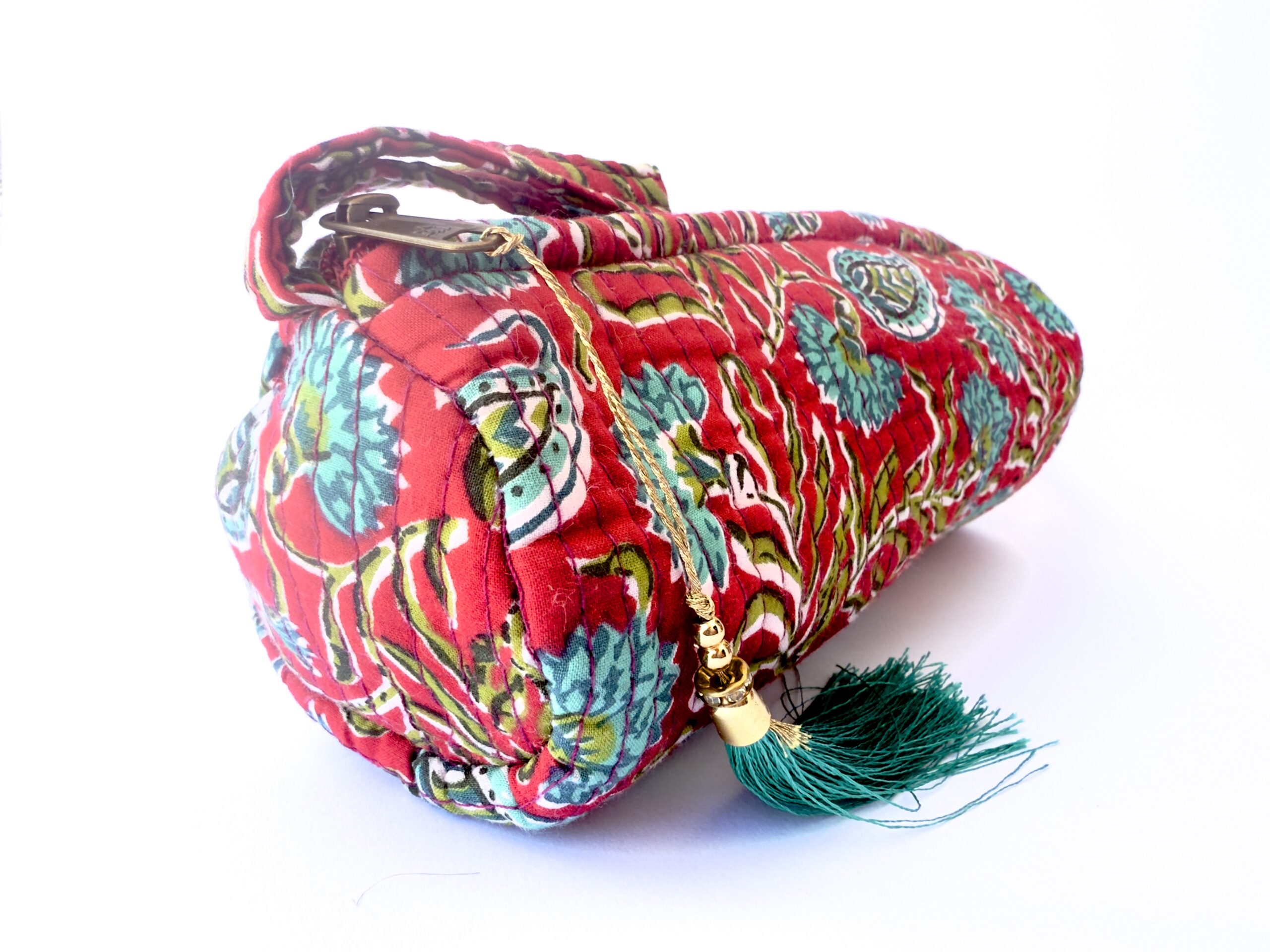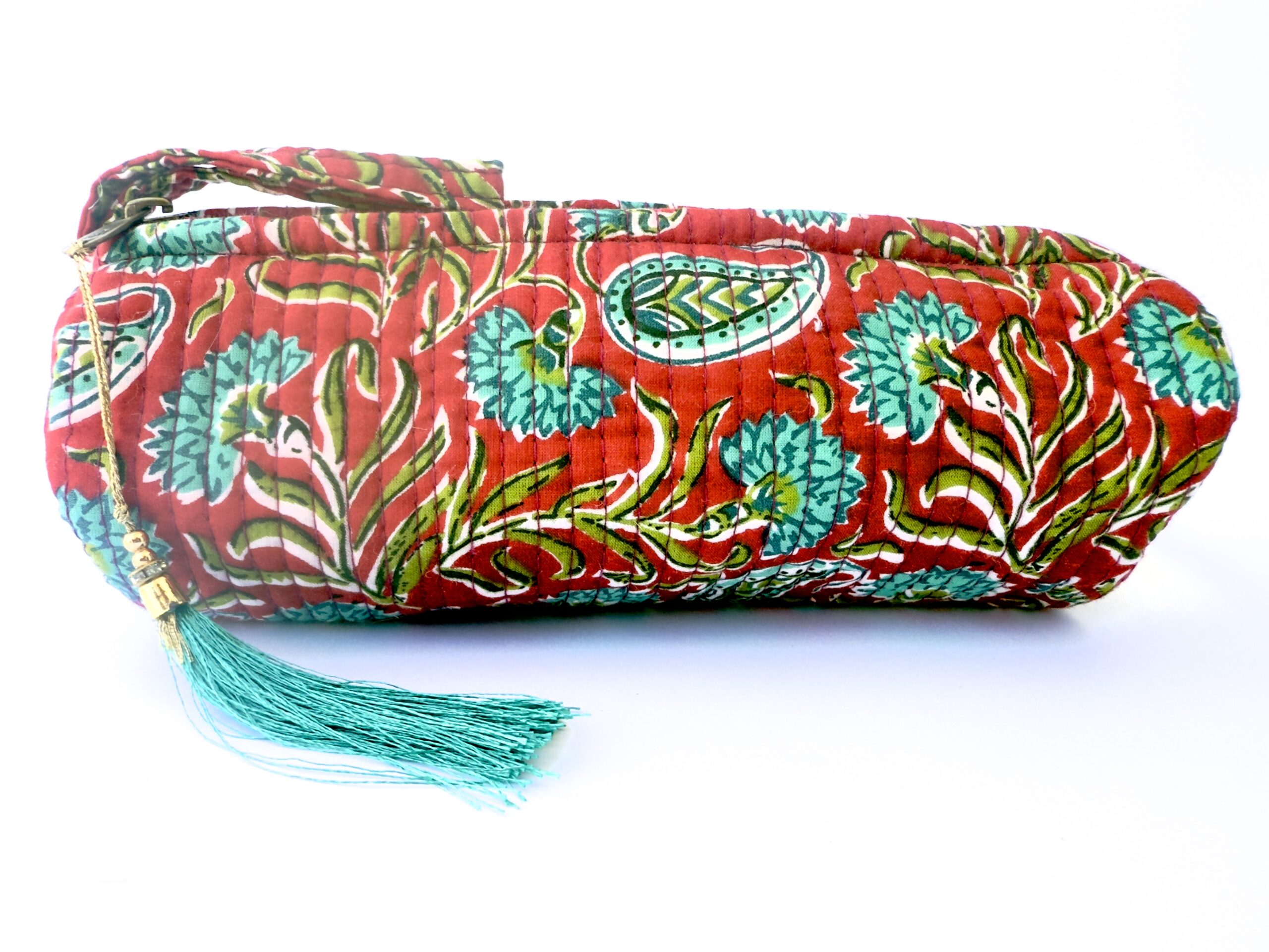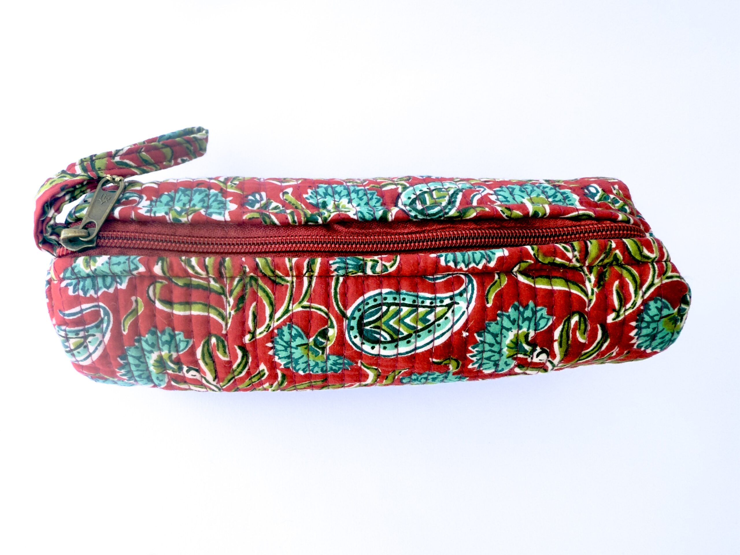Organiza tus lápices, bolis o rotuladores con este encantador estuche redondo de tejido acolchado. Con un fondo rojo y estampado floral en tonos suaves de turquesa, verdes, blanco apagado, este estuche destaca por su diseño alegre y funcional.