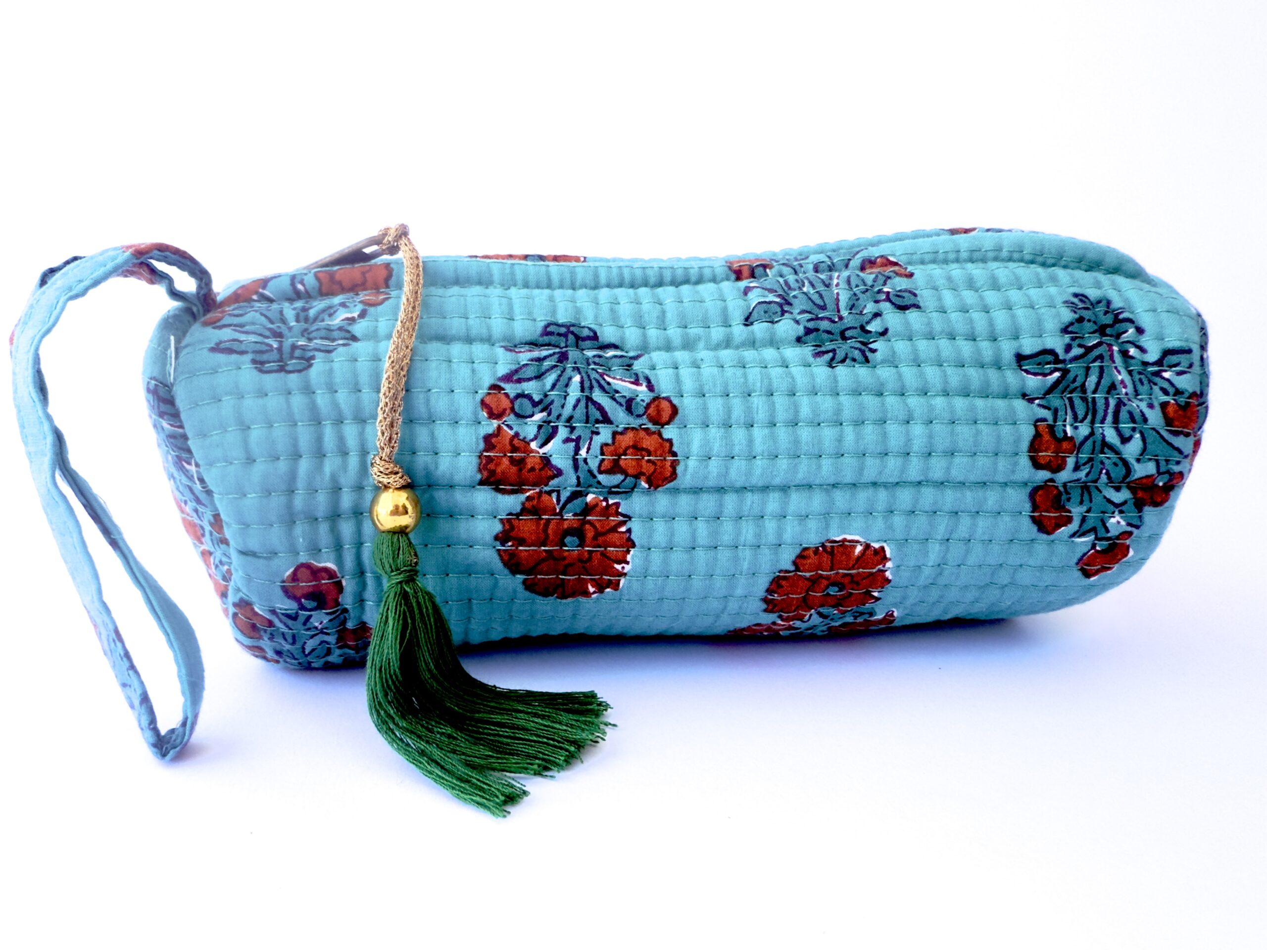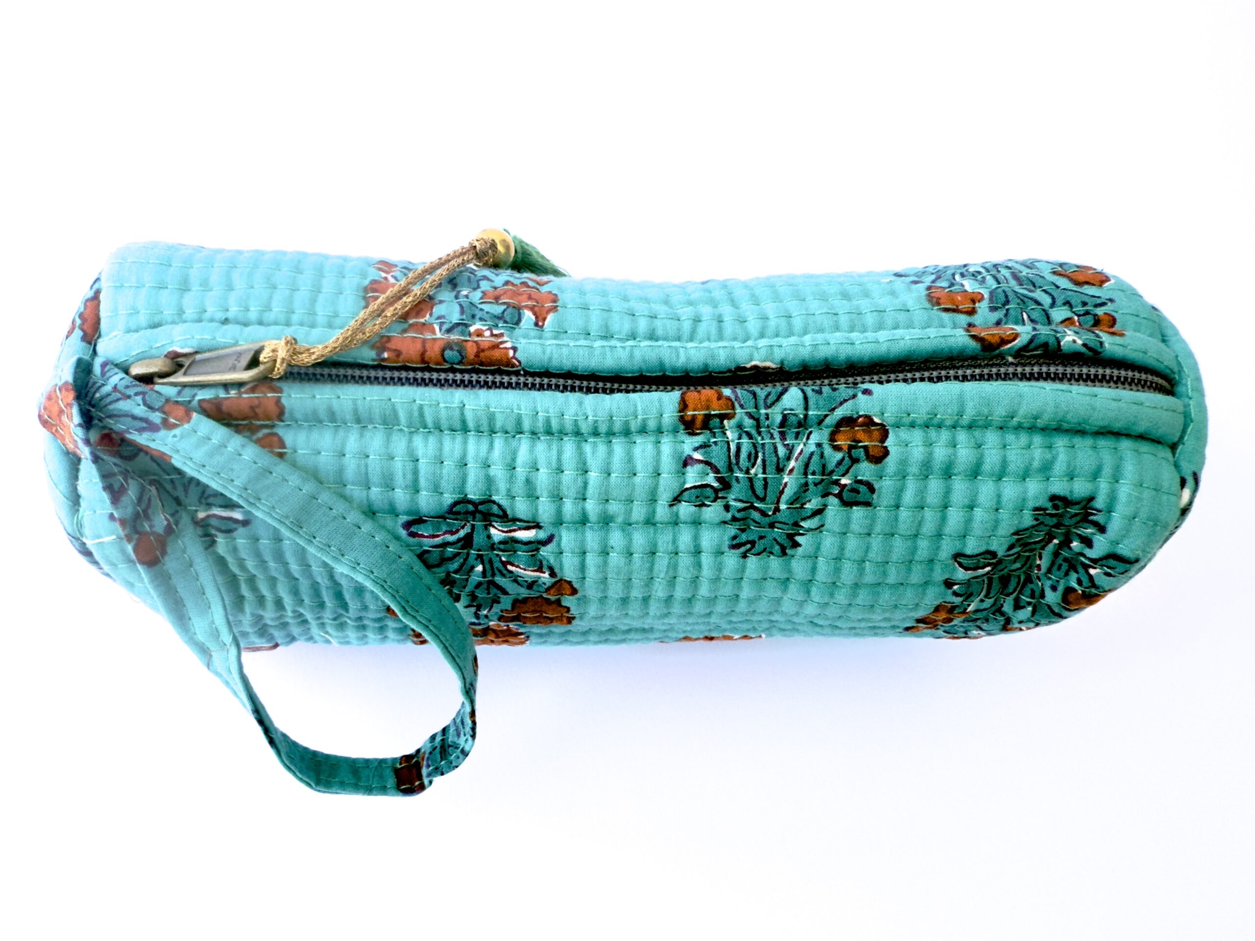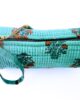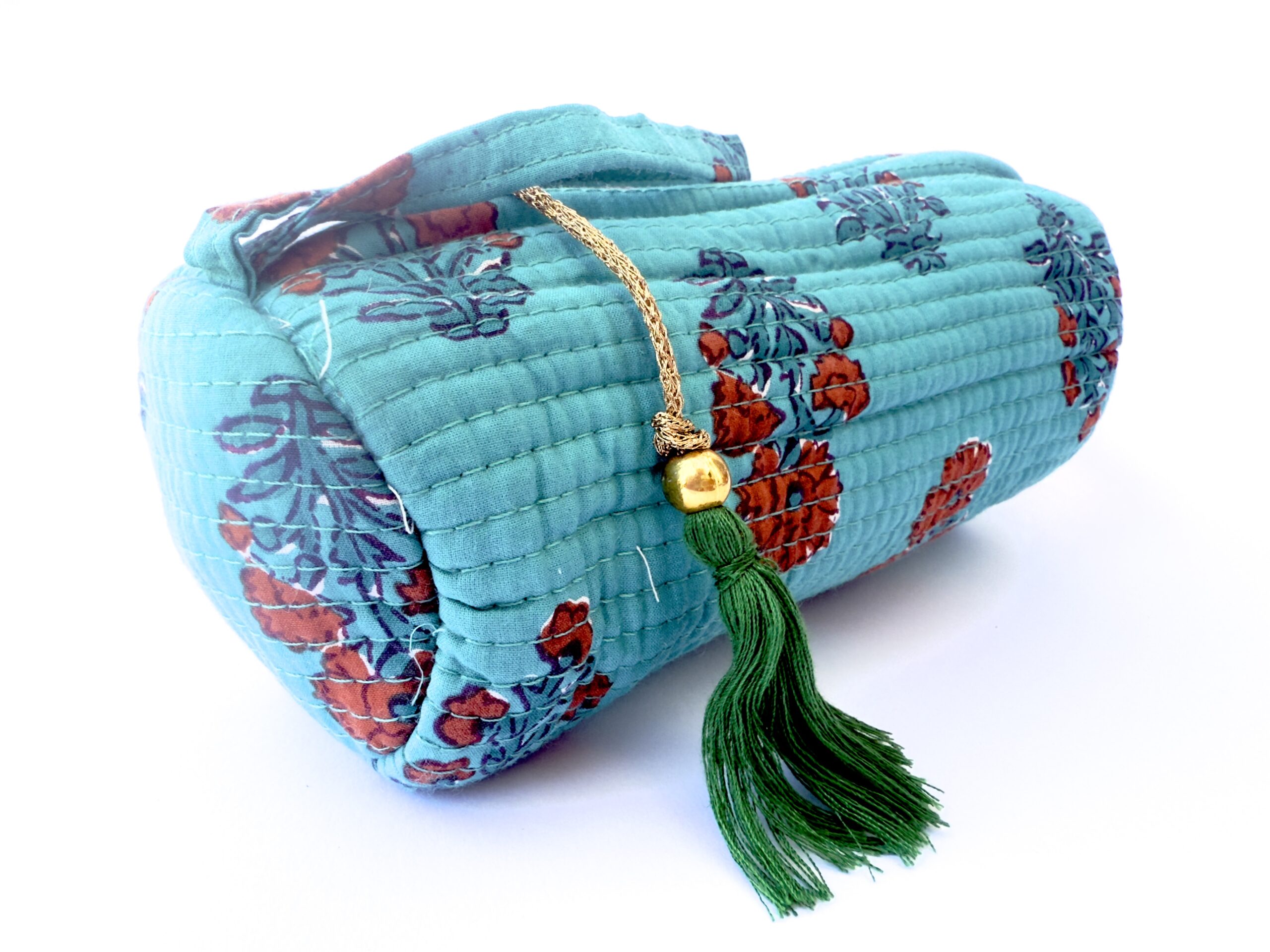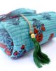 Organiza tus lápices, bolis o rotuladores con este encantador estuche redondo de tejido acolchado. Con un fondo verde turquesa y estampado floral en tonos suaves de rojo,azul, blanco apagado, este estuche destaca por su diseño alegre y funcional.