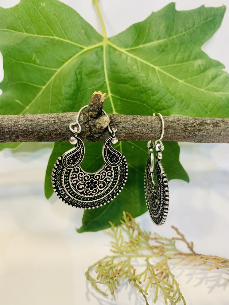 Pendientes boho étnicos en tono plateado envejecido, estilo hippie chic, ideales por su tamaño mediano su forma favorece a cualquier tipo de rostro. Así que no te quedes sin los tuyos.. ¡se sentarán genial!