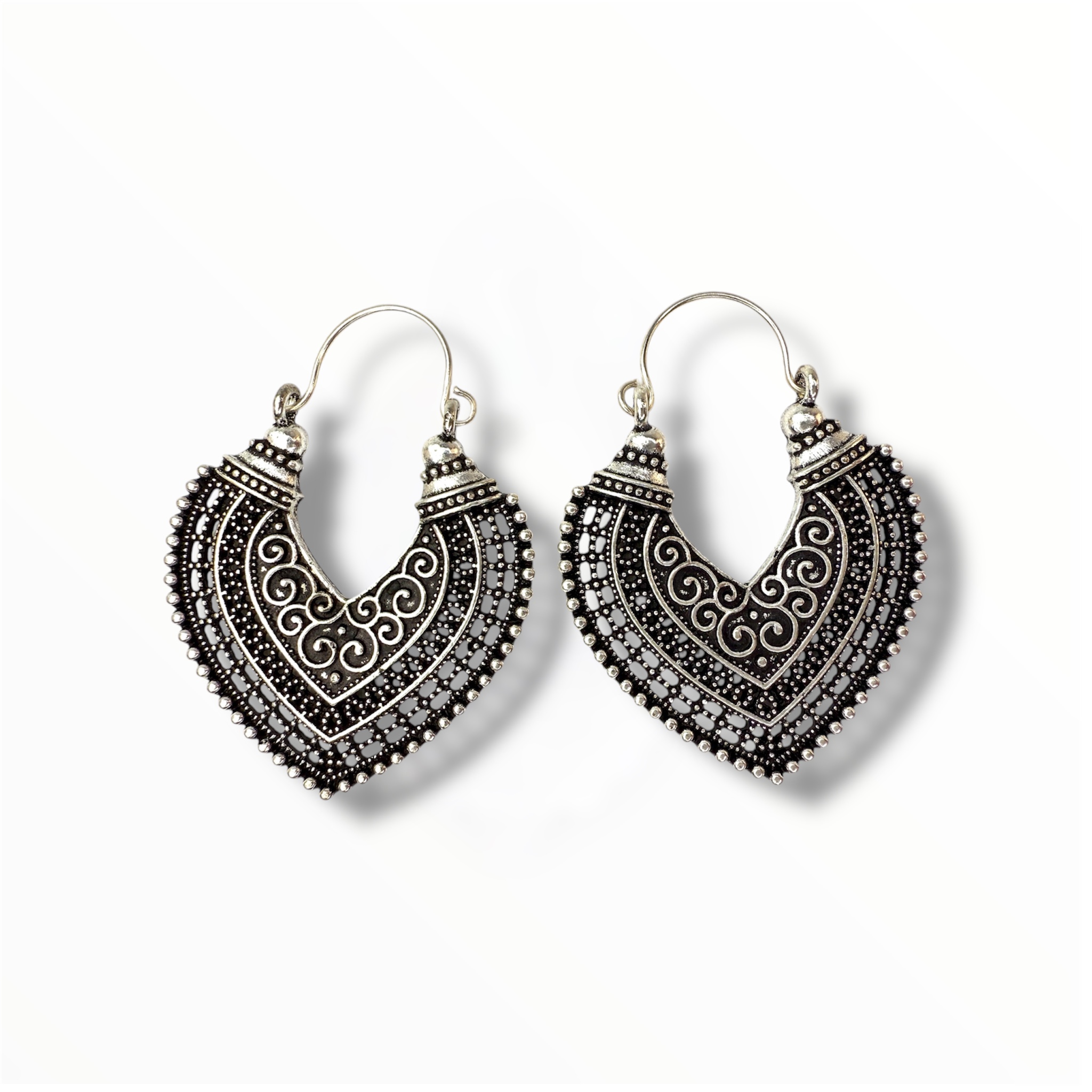 Pendientes boho étnicos en tono plateado envejecido, estilo hippie chic, ideales por su tamaño mediano su forma favorece a cualquier tipo de rostro. Así que no te quedes sin los tuyos.. ¡se sentarán genial!