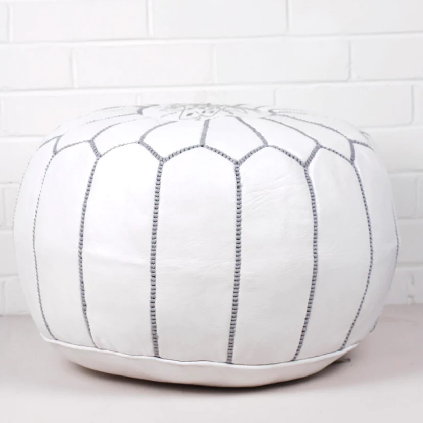 El puf de piel marroquí en blanco, un diseño de puf de cuero tradicional con un toque contemporáneo. Esta otomana en cuero de color blanco está teñida y cosida a mano por artesanos en Marruecos.