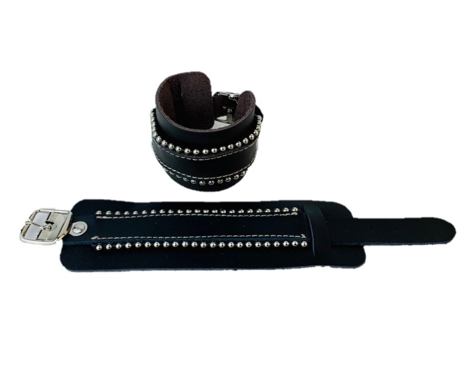 Pulsera es de cuero de vaca ancha de 5 cm con apliques de metal o tachas, cierre de hebilla es un complemento para tu look.