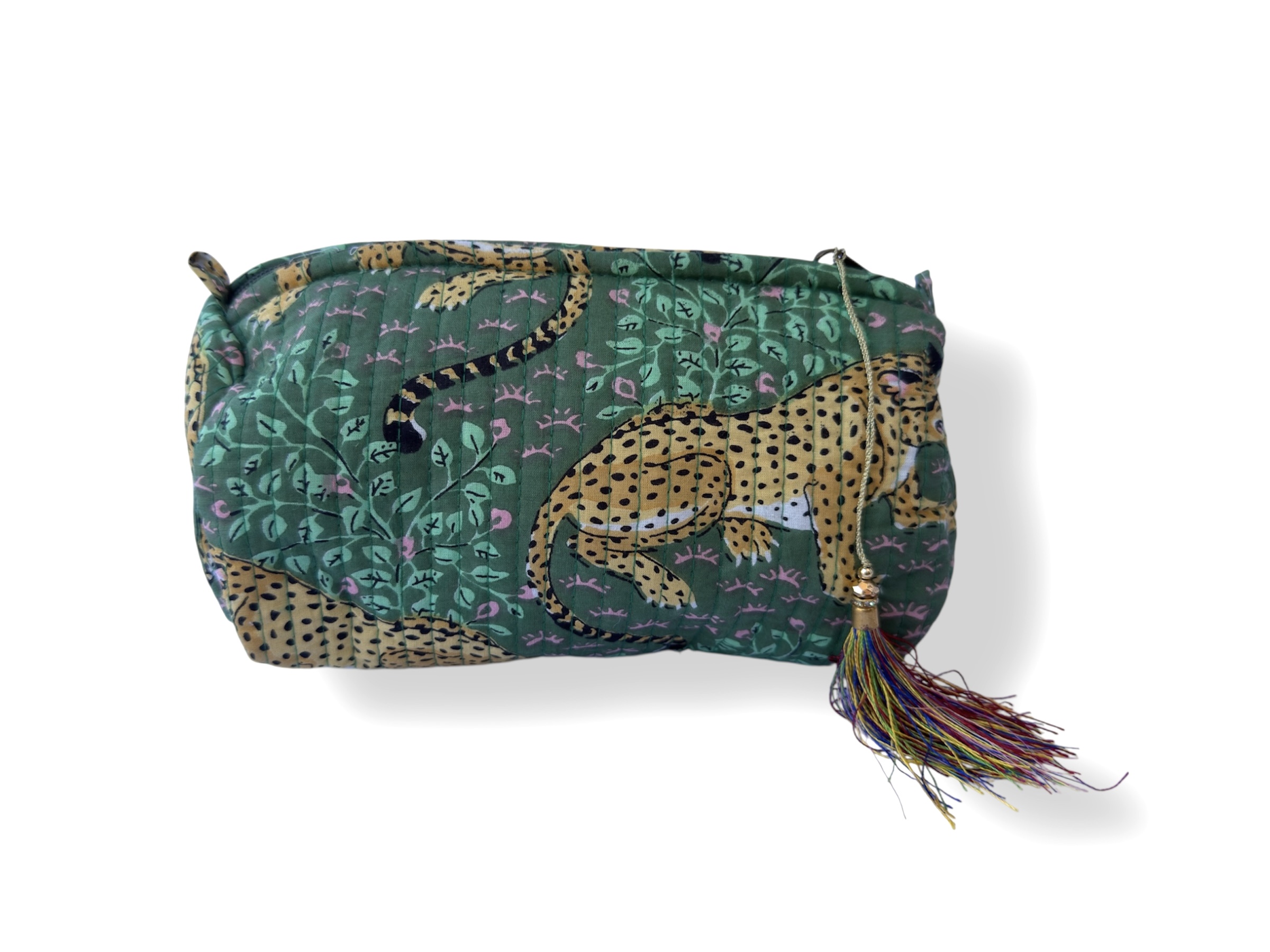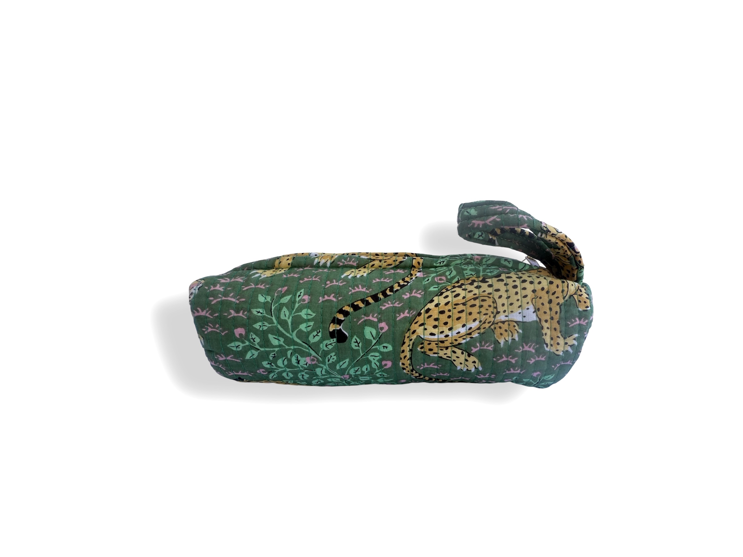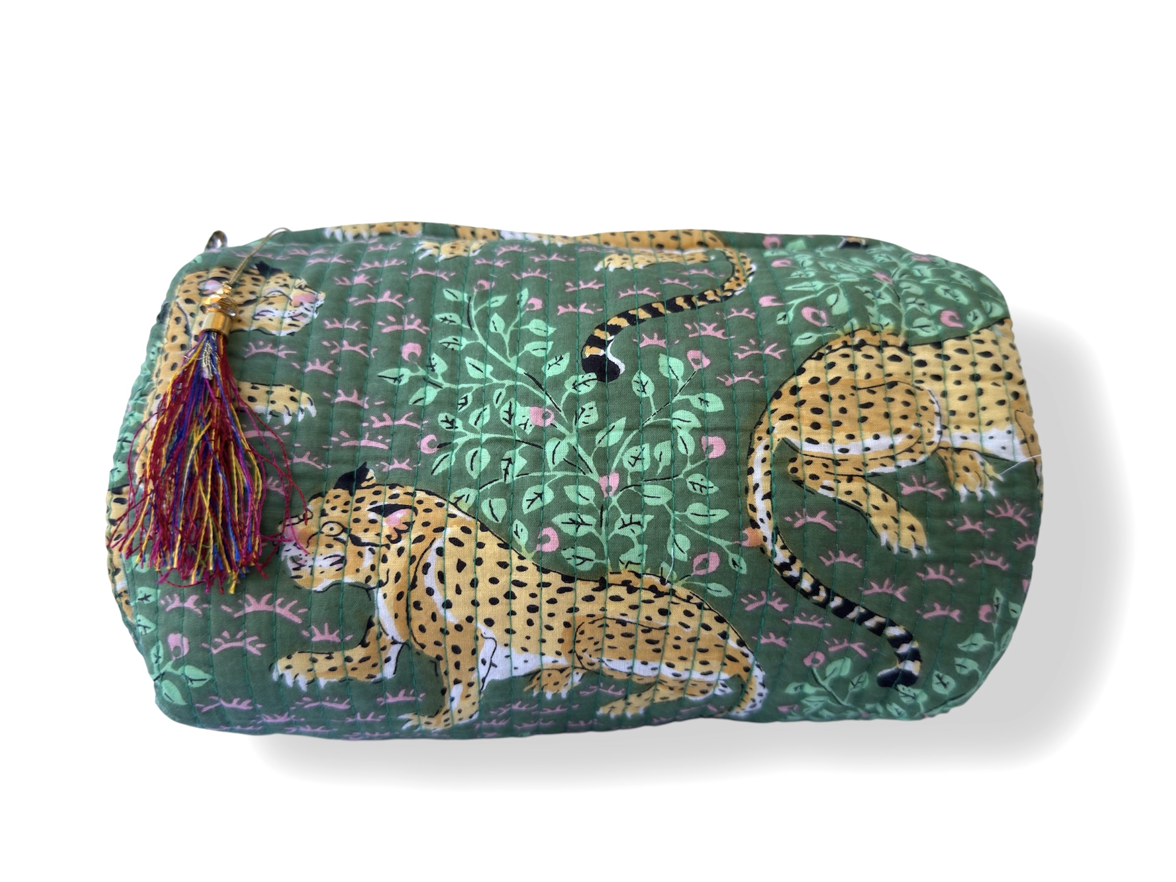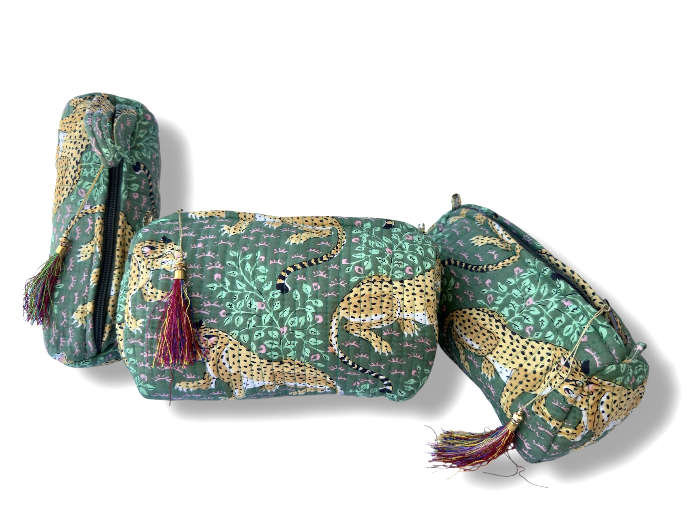 Este set de neceseres es perfecto para quienes buscan organización con estilo. Confeccionados en tela acolchada de alta calidad, destacan por su original estampado de leopardos entre follaje verde sobre un fondo verde, que aporta un toque exótico y sofisticado.